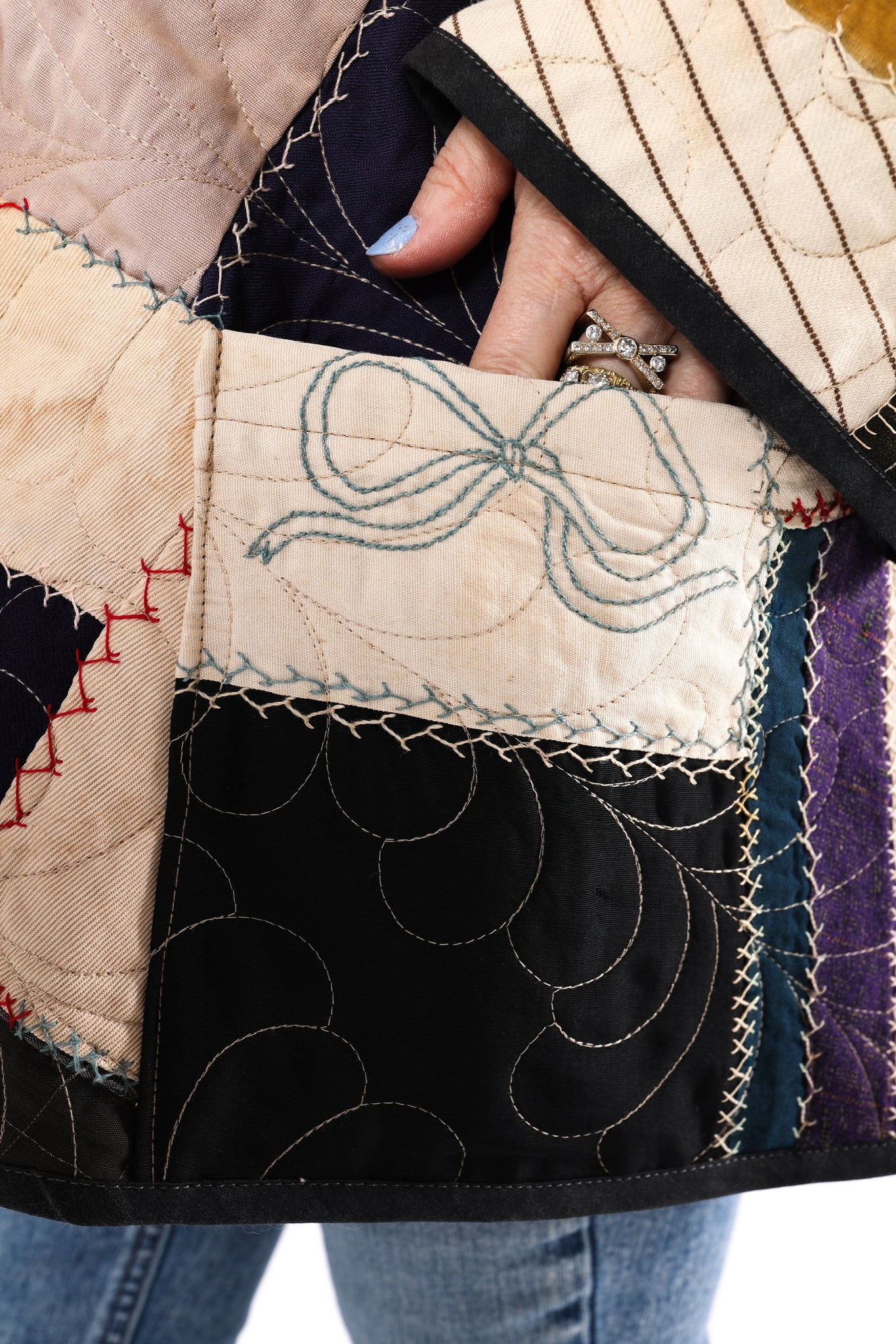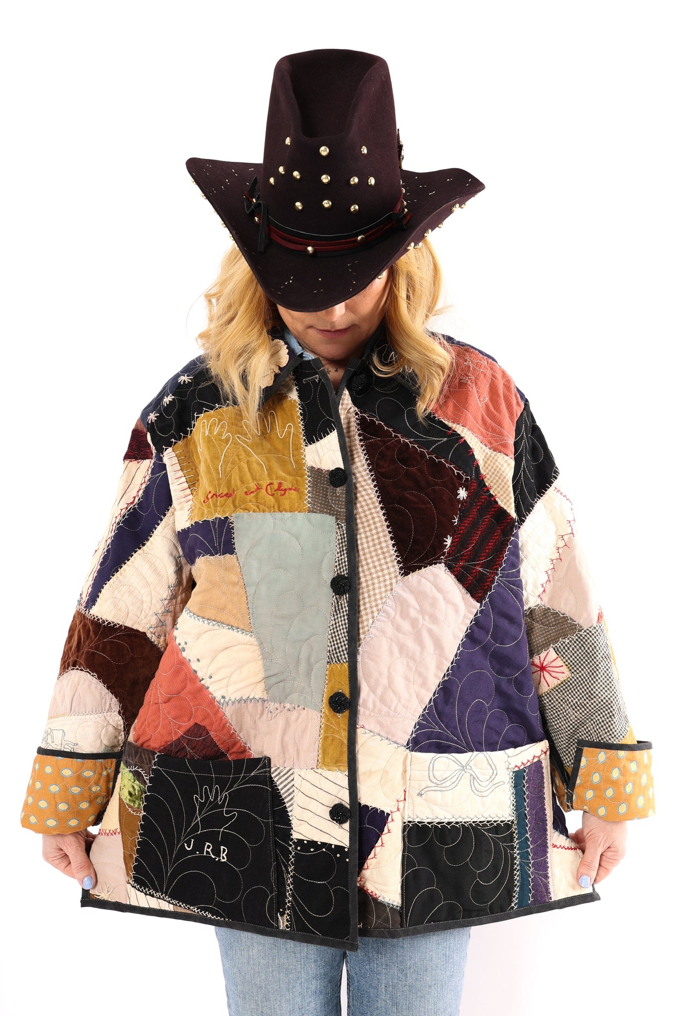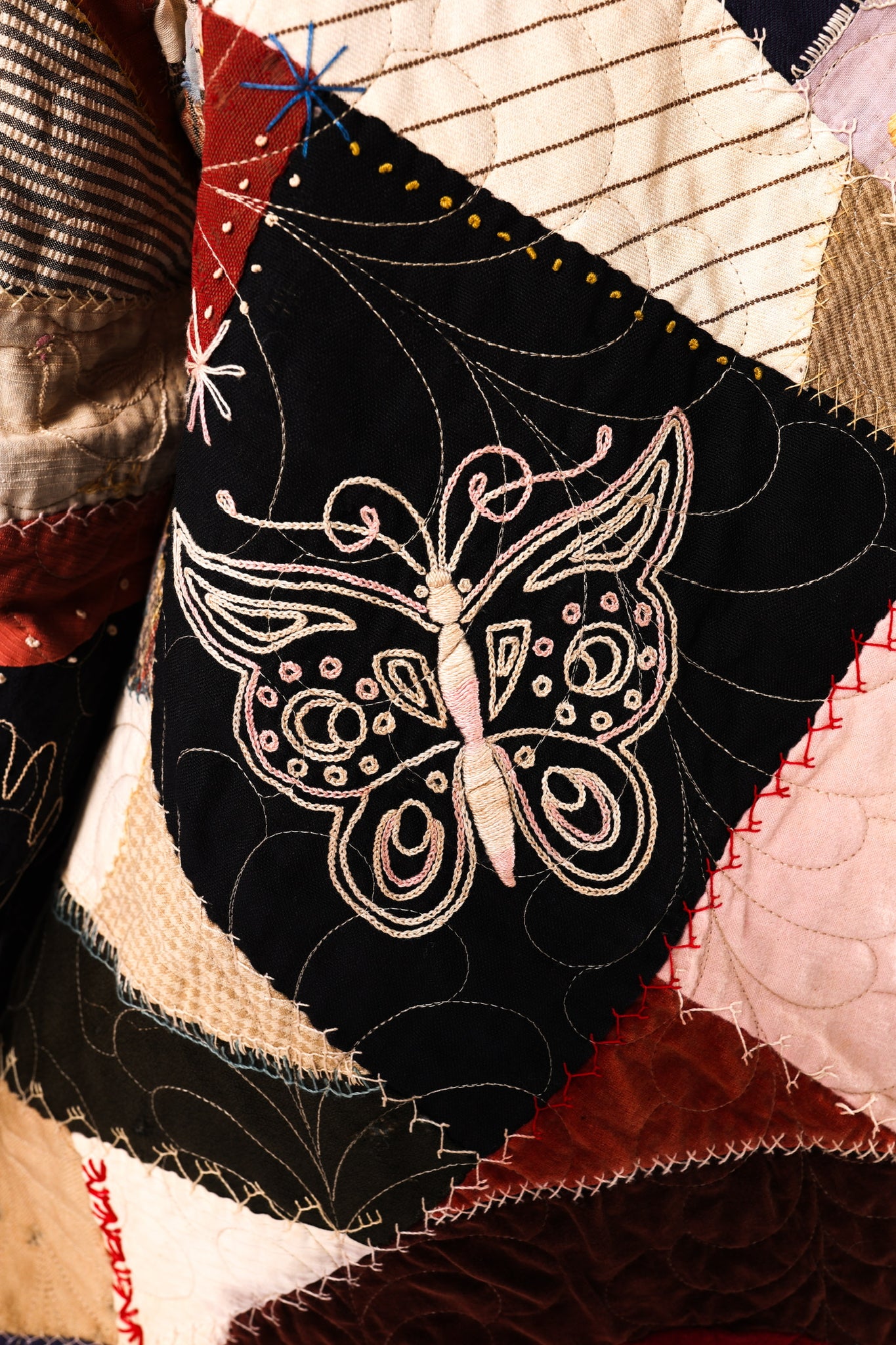 This is an antique American quilt top that was made in 1913. We know this because it was hand embroidered on the quilt. We have preserved the provenance and placed it on the back as a focal point. We believe this to be a family or cousins quilt and was probably embroidered by children. Please take note of the ornate butterfly as well as the hand prints that we have placed on a shoulder. This quilt carries great sentiment! To bring the quilt top to life, we backed and longarmed it. For closures we used vintage black buttons. In our opinion, the quilt is extremely thin and lightweight for a crazy quilt. In keeping with the genre, it contains, velvet, homespun ginghams, wool, and felt fabrics. Please note, there are two flaws that we have photographed and videoed. This is a size LARGE, please read size measurements below. This piece fits a range of sizes depending on how you like to style your jackets. If you have any questions please direct message us and we are happy to bore you with many more details.