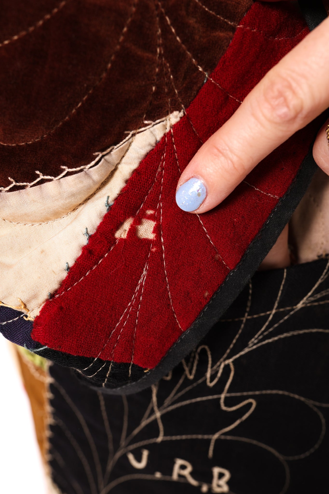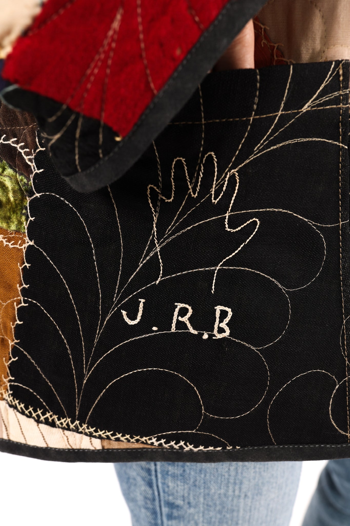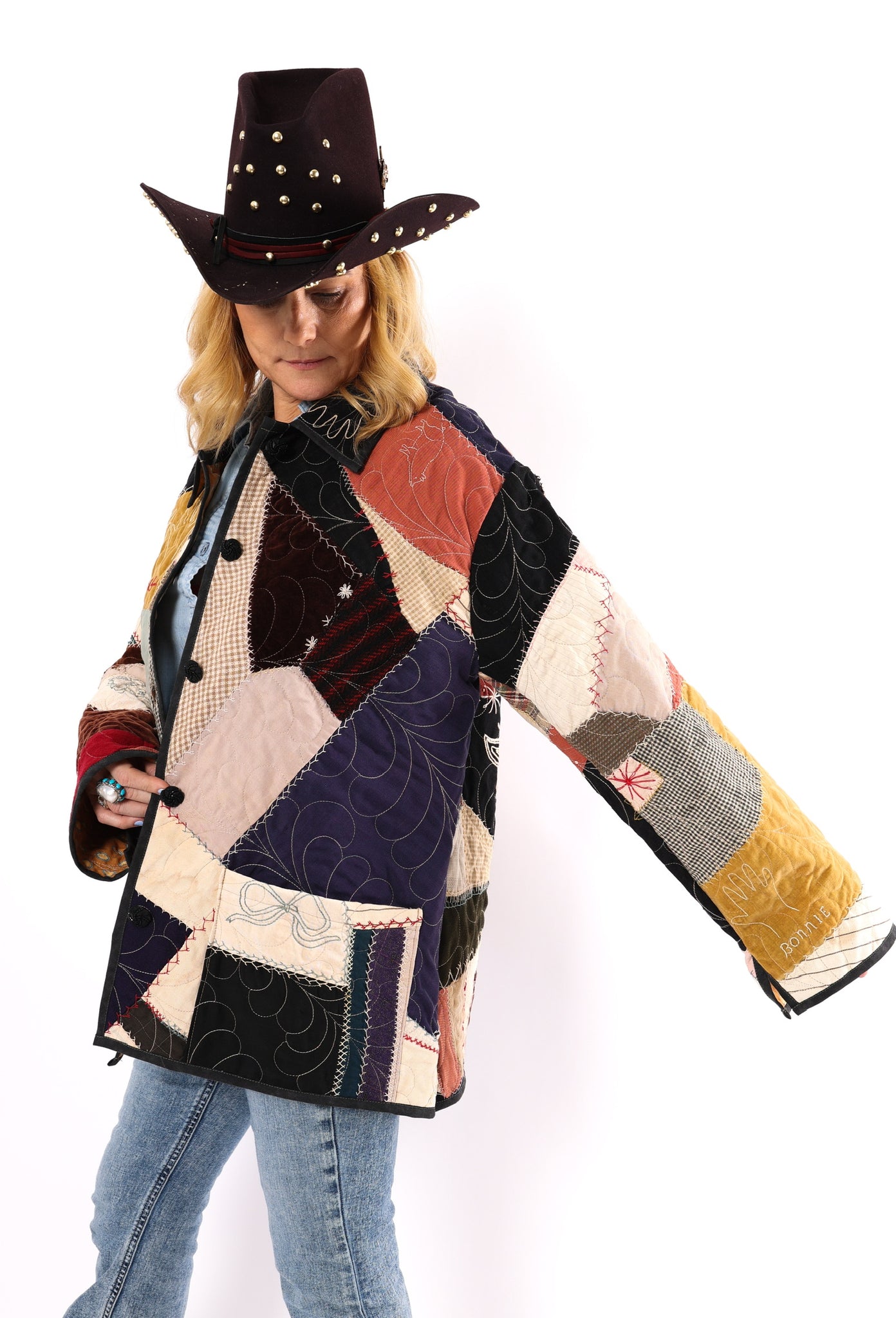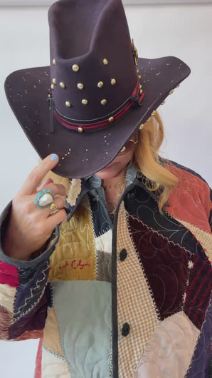 This is an antique American quilt top that was made in 1913. We know this because it was hand embroidered on the quilt. We have preserved the provenance and placed it on the back as a focal point. We believe this to be a family or cousins quilt and was probably embroidered by children. Please take note of the ornate butterfly as well as the hand prints that we have placed on a shoulder. This quilt carries great sentiment! To bring the quilt top to life, we backed and longarmed it. For closures we used vintage black buttons. In our opinion, the quilt is extremely thin and lightweight for a crazy quilt. In keeping with the genre, it contains, velvet, homespun ginghams, wool, and felt fabrics. Please note, there are two flaws that we have photographed and videoed. This is a size LARGE, please read size measurements below. This piece fits a range of sizes depending on how you like to style your jackets. If you have any questions please direct message us and we are happy to bore you with many more details.