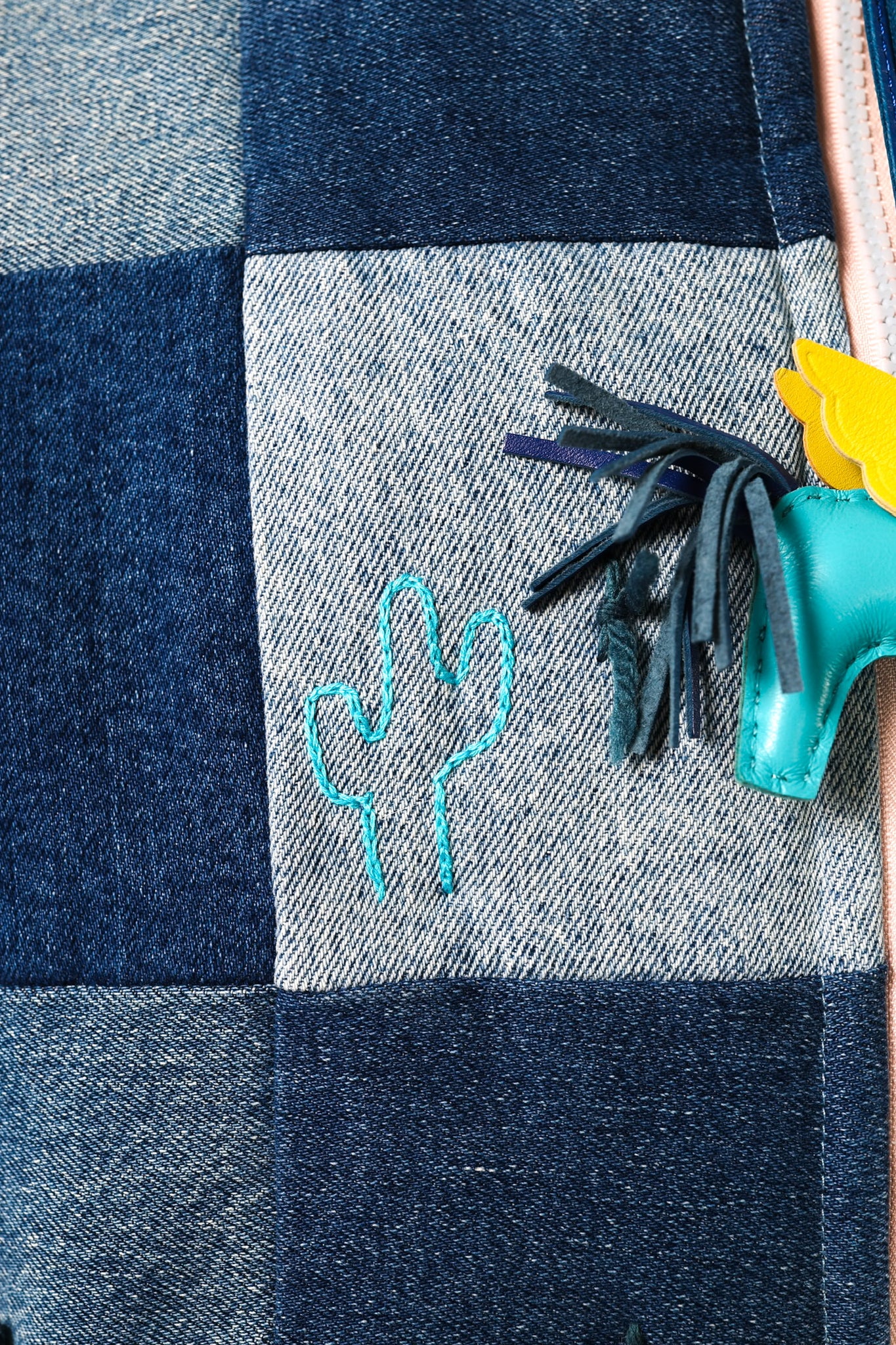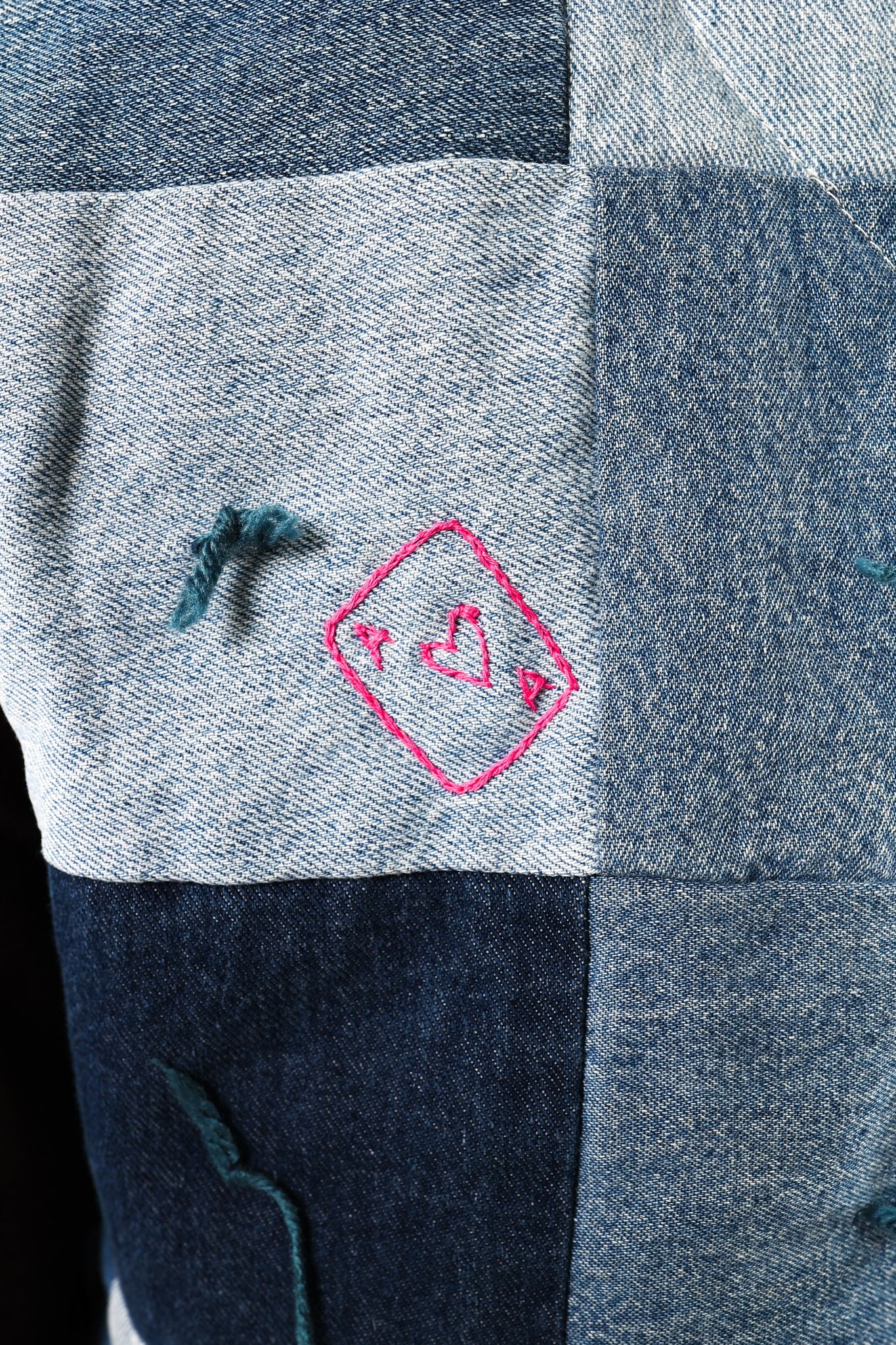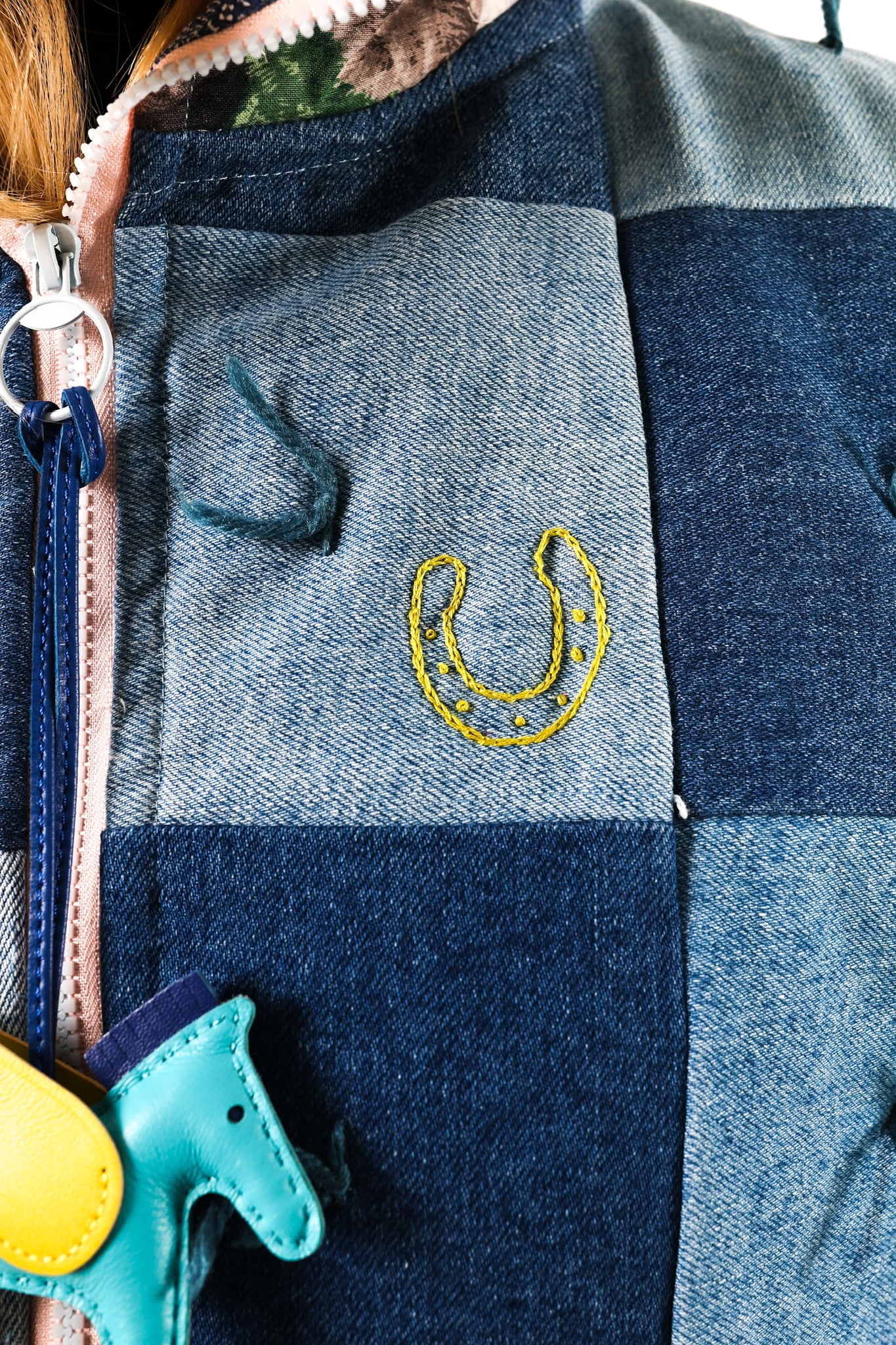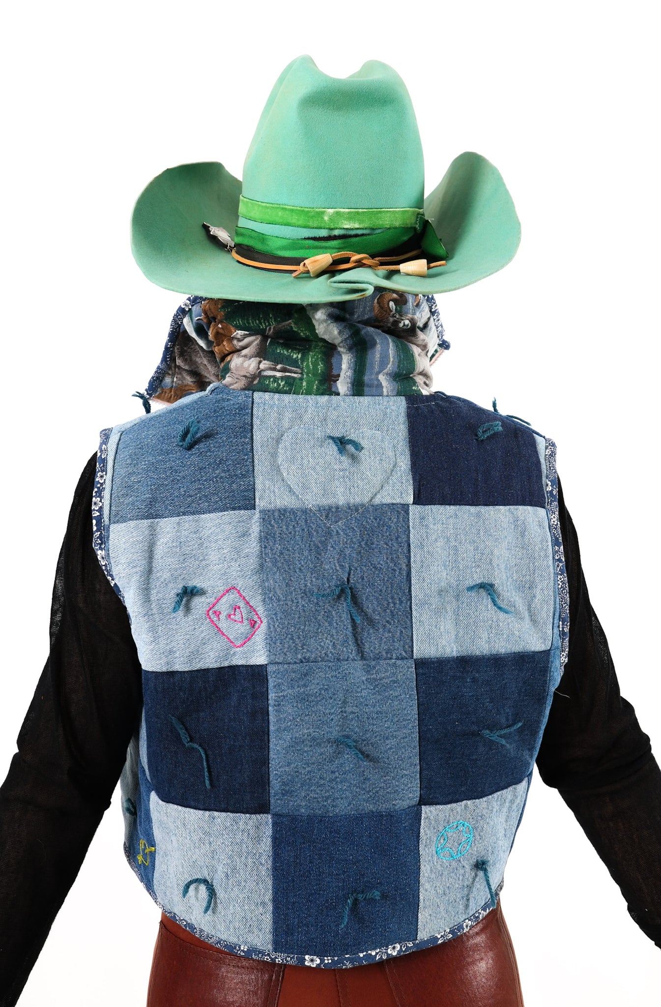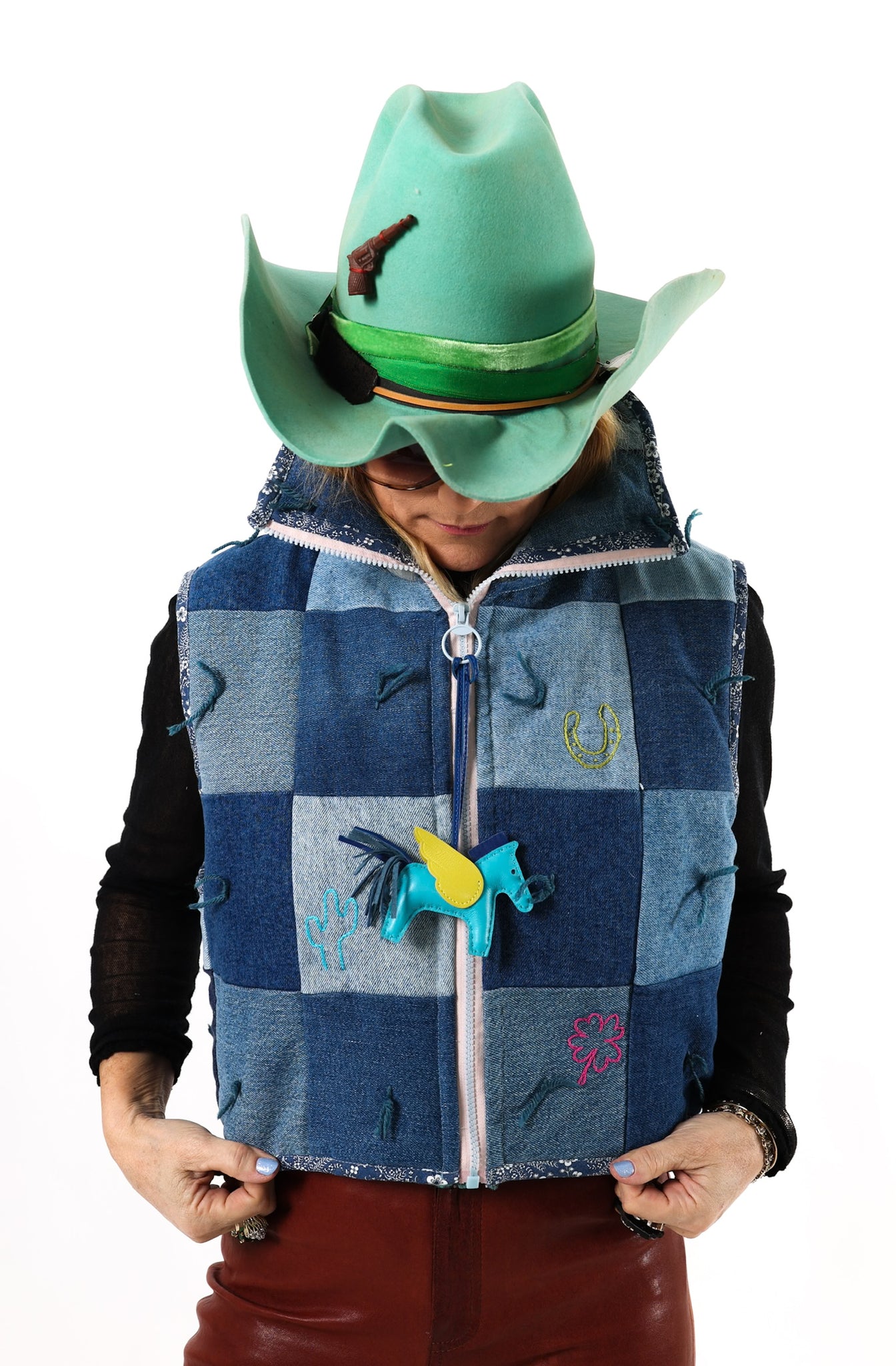 This is a vintage American denim quilt made circa 1970s. It is a traditional large scale Postage Stamp quilt pattern. In the center of each square the maker hand knotted a yarn detail which adds a darling accent throughout the quilt! The maker backed this quilt with western nature scene which will make you reminiscent of cabin trips and weekends in the woods! To add a little extra fun we had Melissa from our sewing room hand embroider little motifs all over the vest. For another pop of fun and because we don't like naked zippers, we are sending this with a little horse charm. If you don’t like it you can easily remove and use as a purse charm. The vest does have loft (puffiness). The quilt is in great condition. This vest is a Small/Medium. It is designed to be a cropped and boxy fit. Please read the size measurements below for best fit! If you have further questions, please direct message us and we are happy to send you a video.