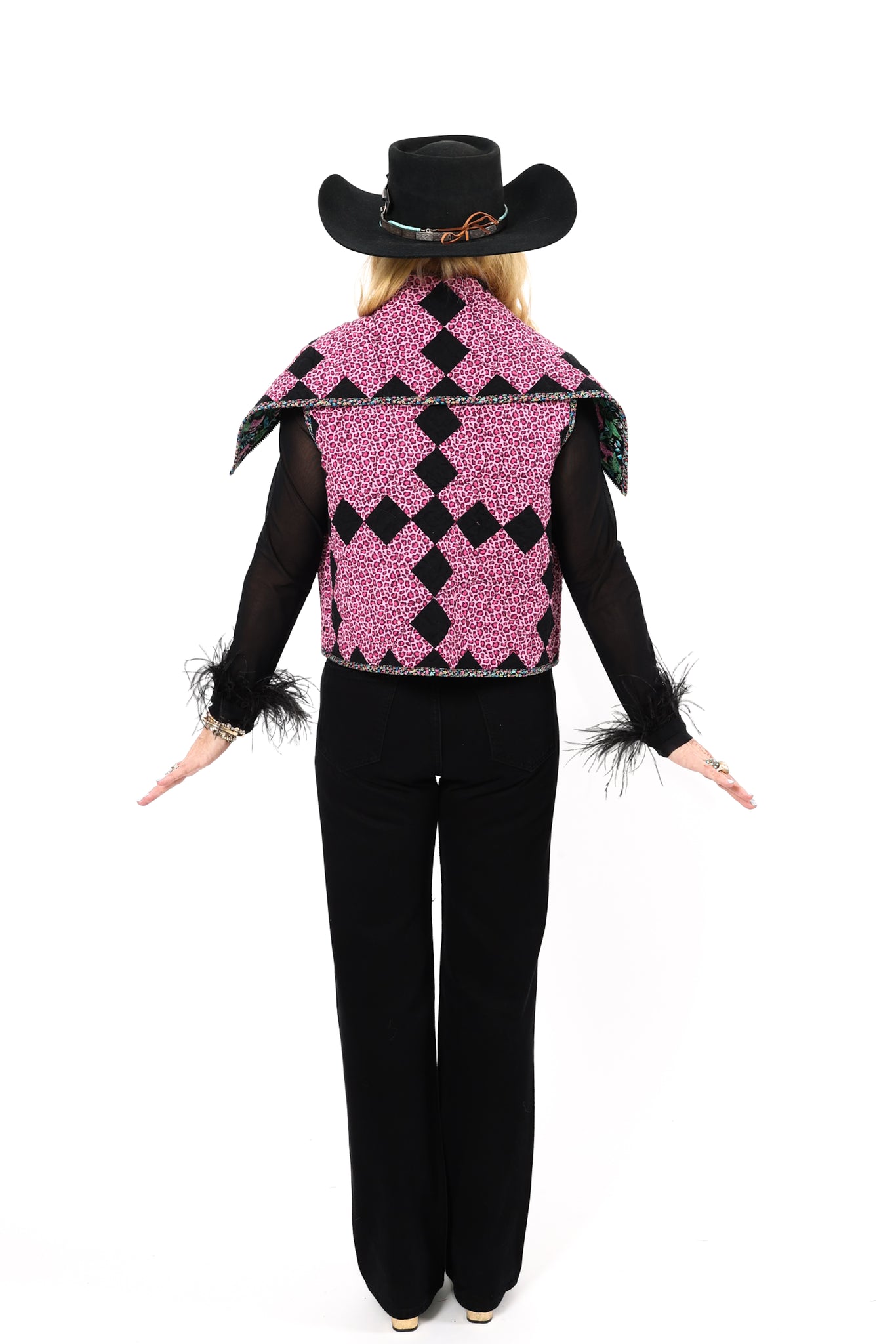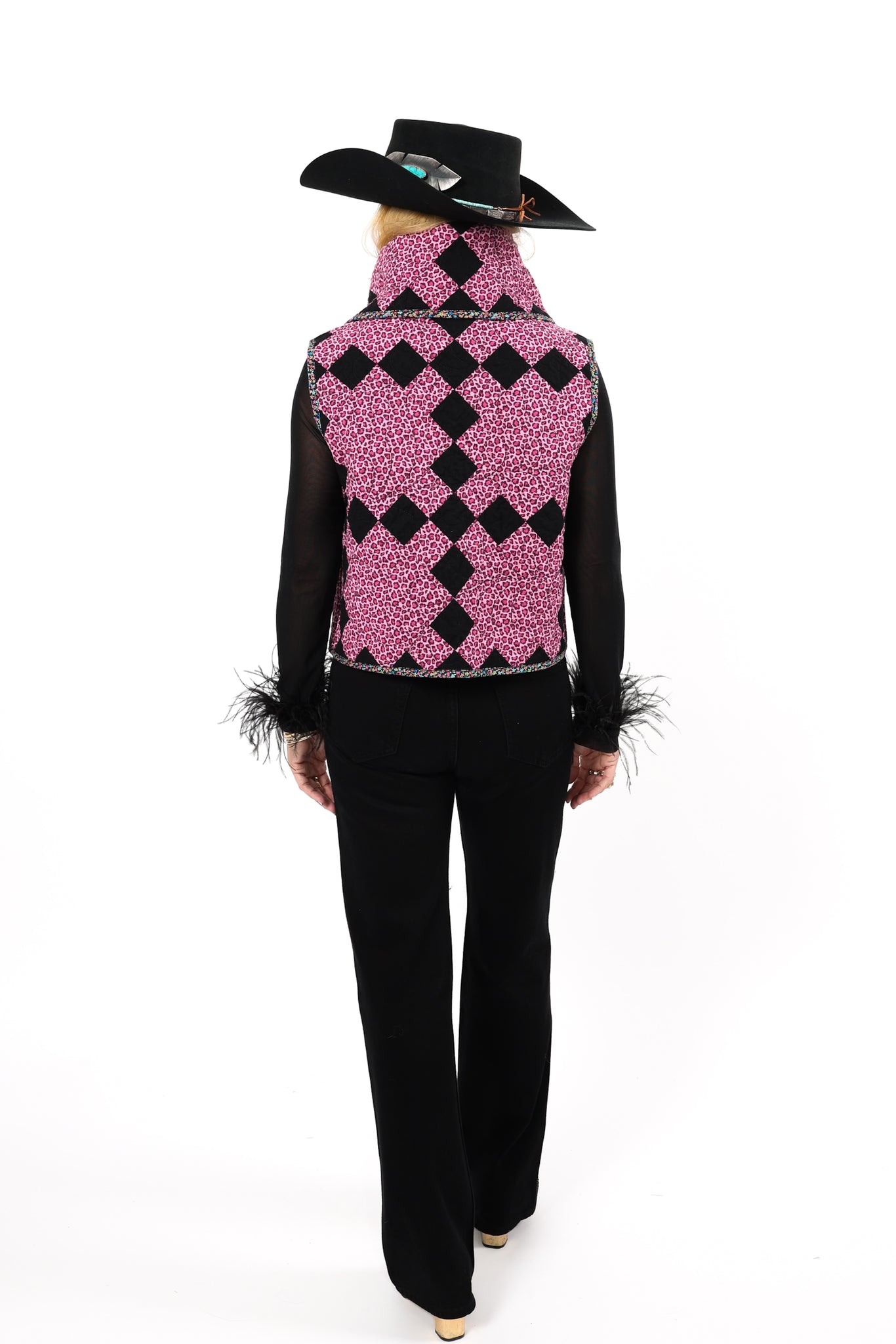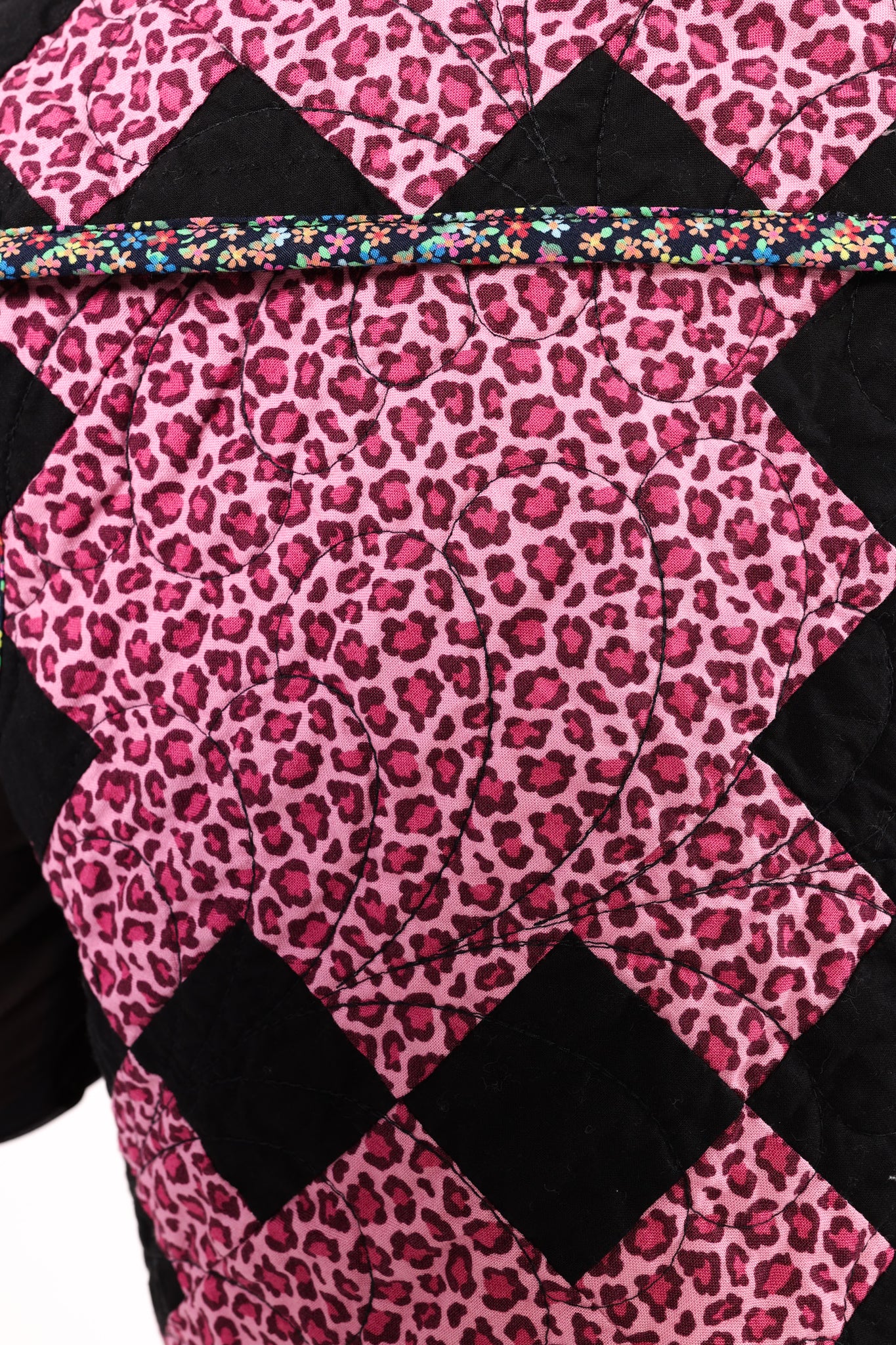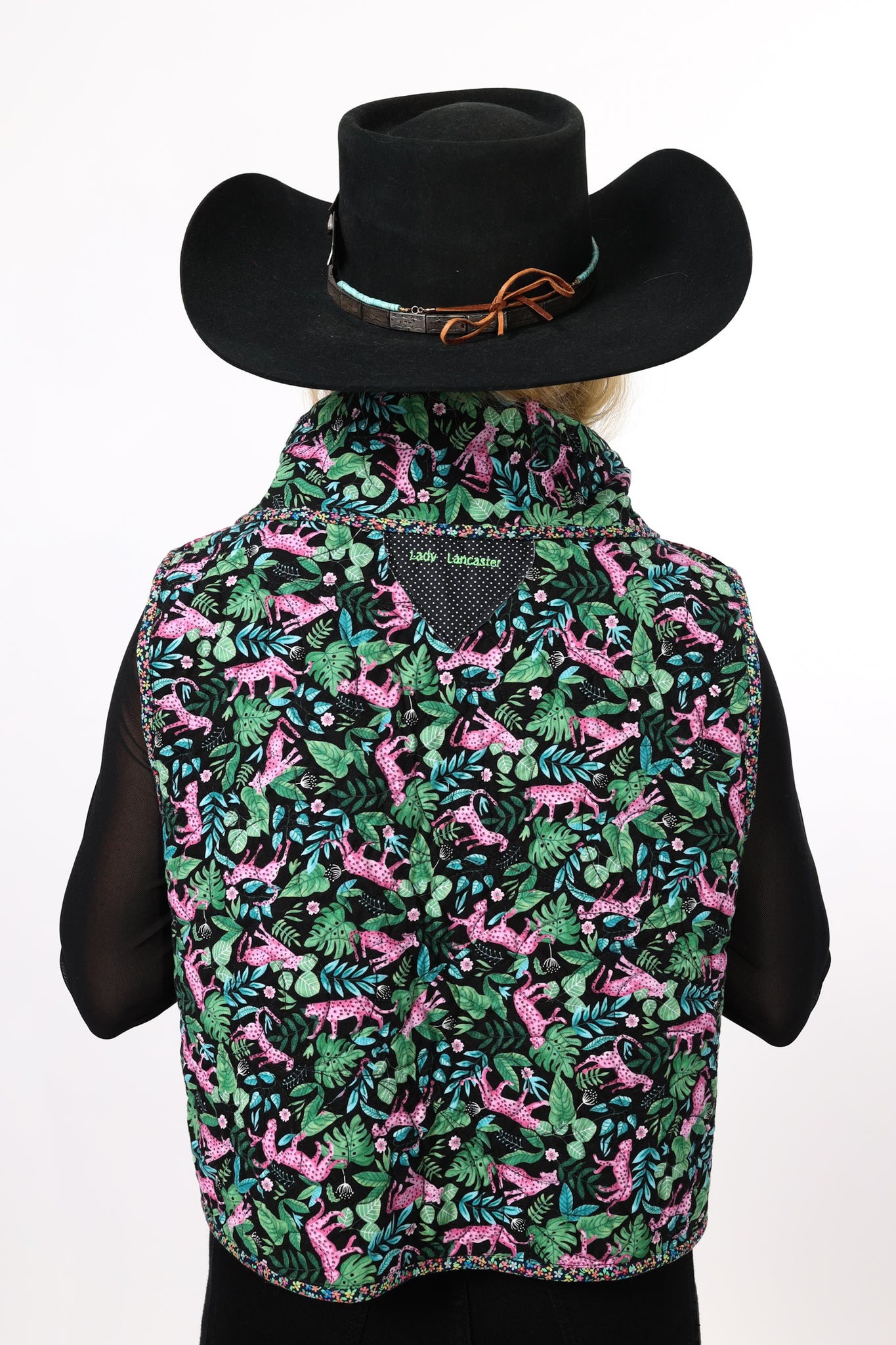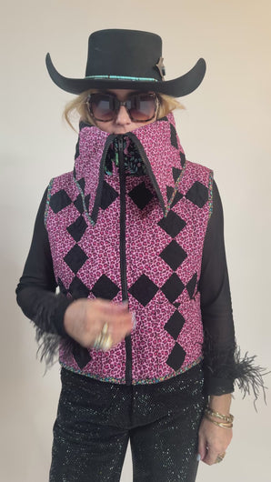 This is a future heirloom and a Lady Lancaster original design. It is a traditional Irish Chain quilt pattern. The quilt is a combination of leopard print fabric and leopard novelty fabric. It is a truly one of kind piece! This vest has a dramatic shawl collar, two front pockets, and is designed to be a cropped and boxy fit! This vest is a Small. Please read the size measurements below for best fit! The quilt is soft, thin, and lightweight. Since this piece contains all new fabrics, you do not have to handle it with kid gloves! If you have further questions, please direct message us and we are happy to send you a video.