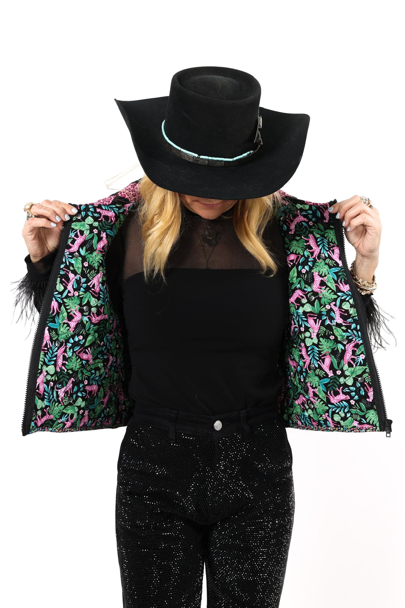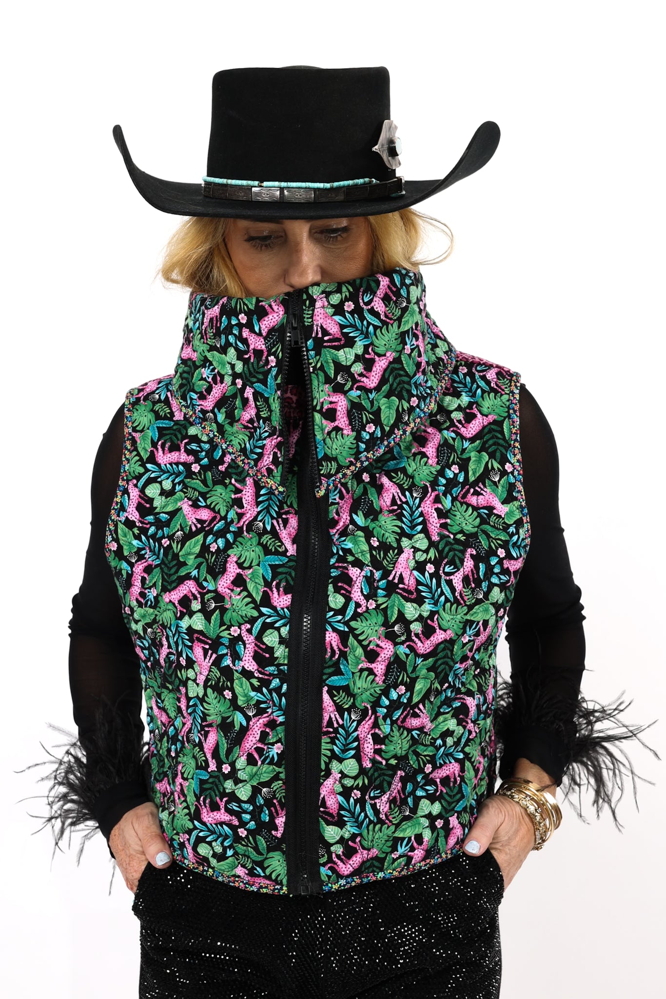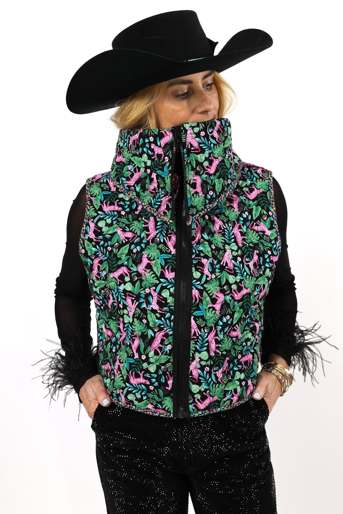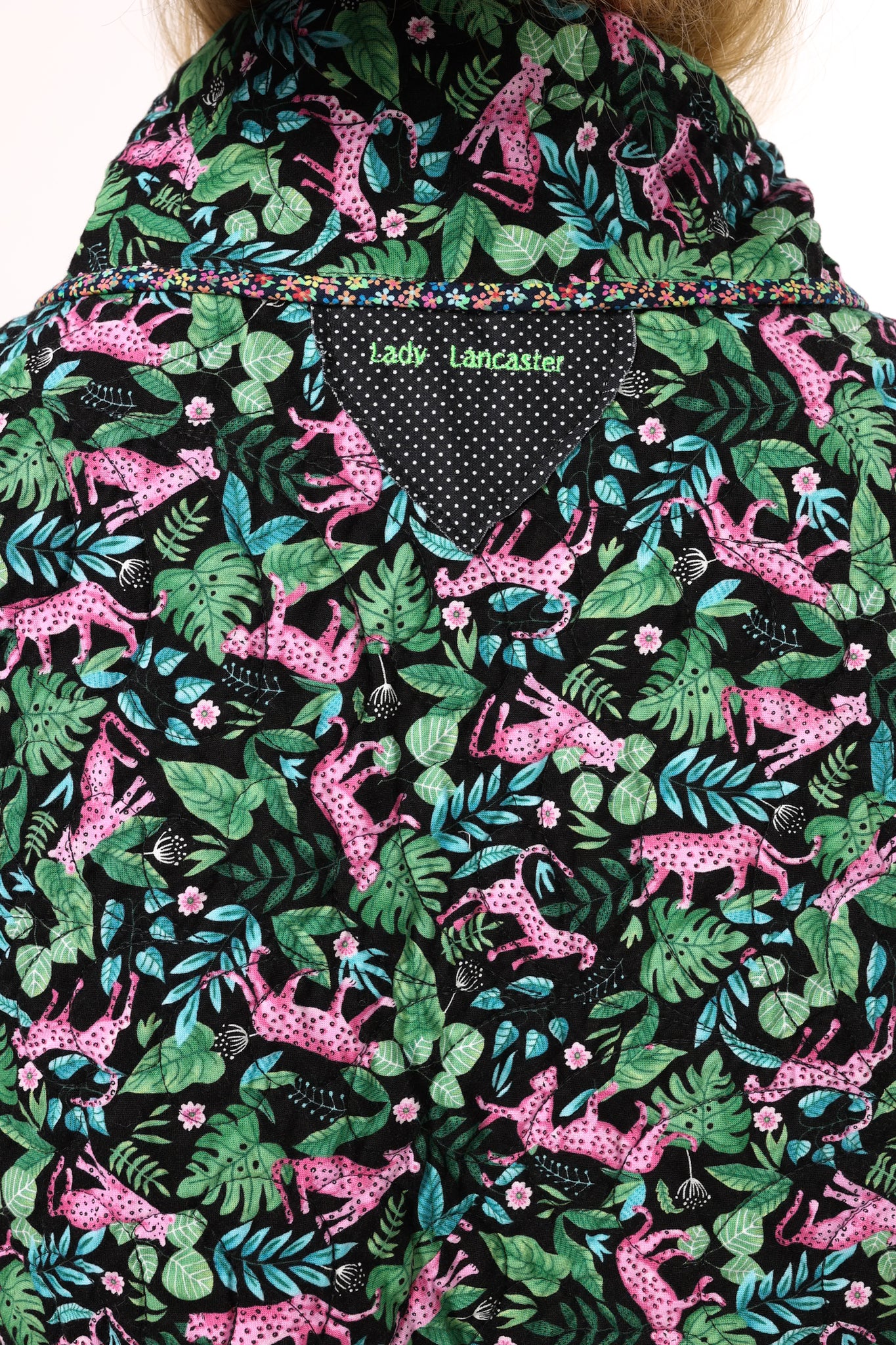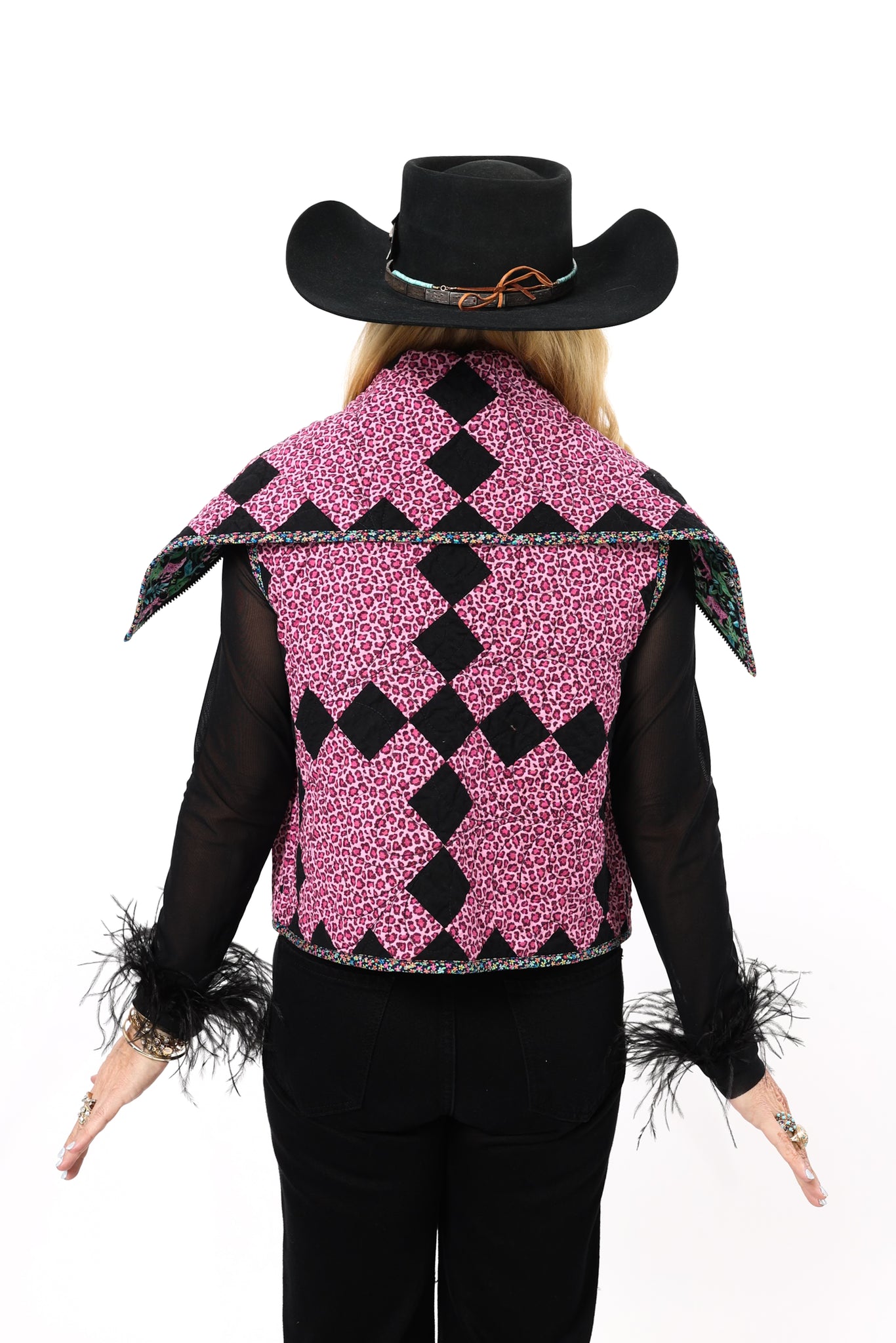 This is a future heirloom and a Lady Lancaster original design. It is a traditional Irish Chain quilt pattern. The quilt is a combination of leopard print fabric and leopard novelty fabric. It is a truly one of kind piece! This vest has a dramatic shawl collar, two front pockets, and is designed to be a cropped and boxy fit! This vest is a Small. Please read the size measurements below for best fit! The quilt is soft, thin, and lightweight. Since this piece contains all new fabrics, you do not have to handle it with kid gloves! If you have further questions, please direct message us and we are happy to send you a video.