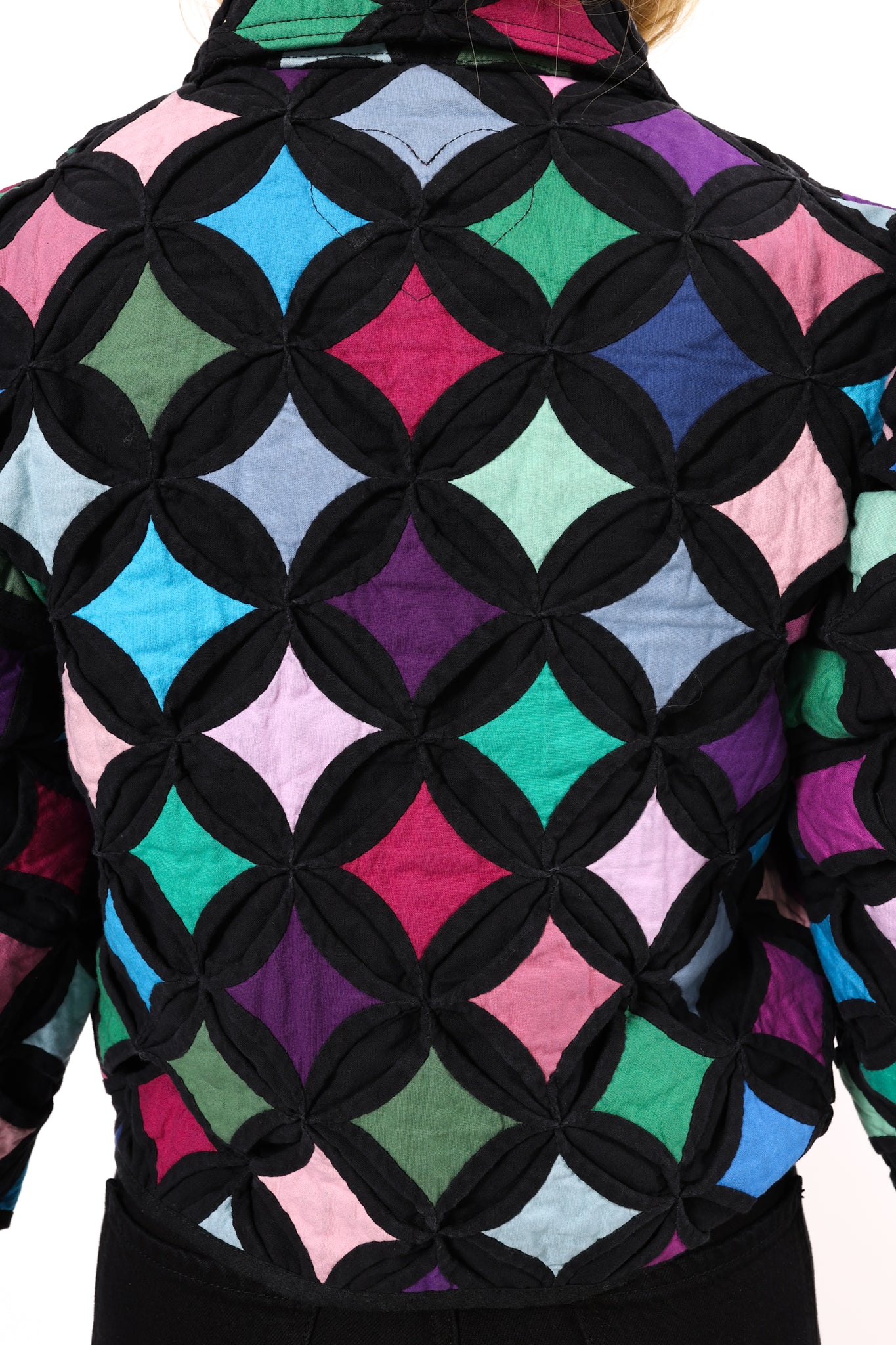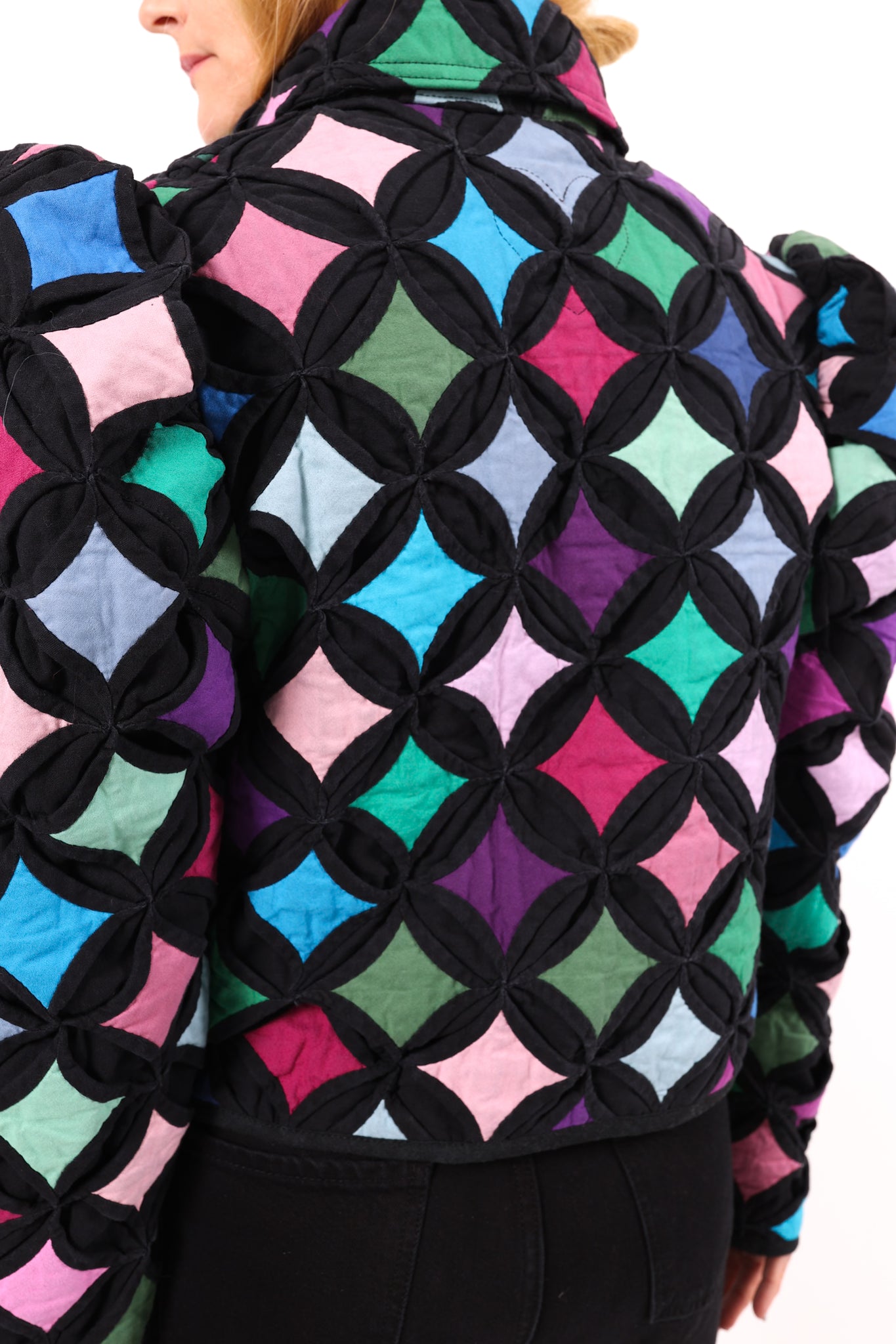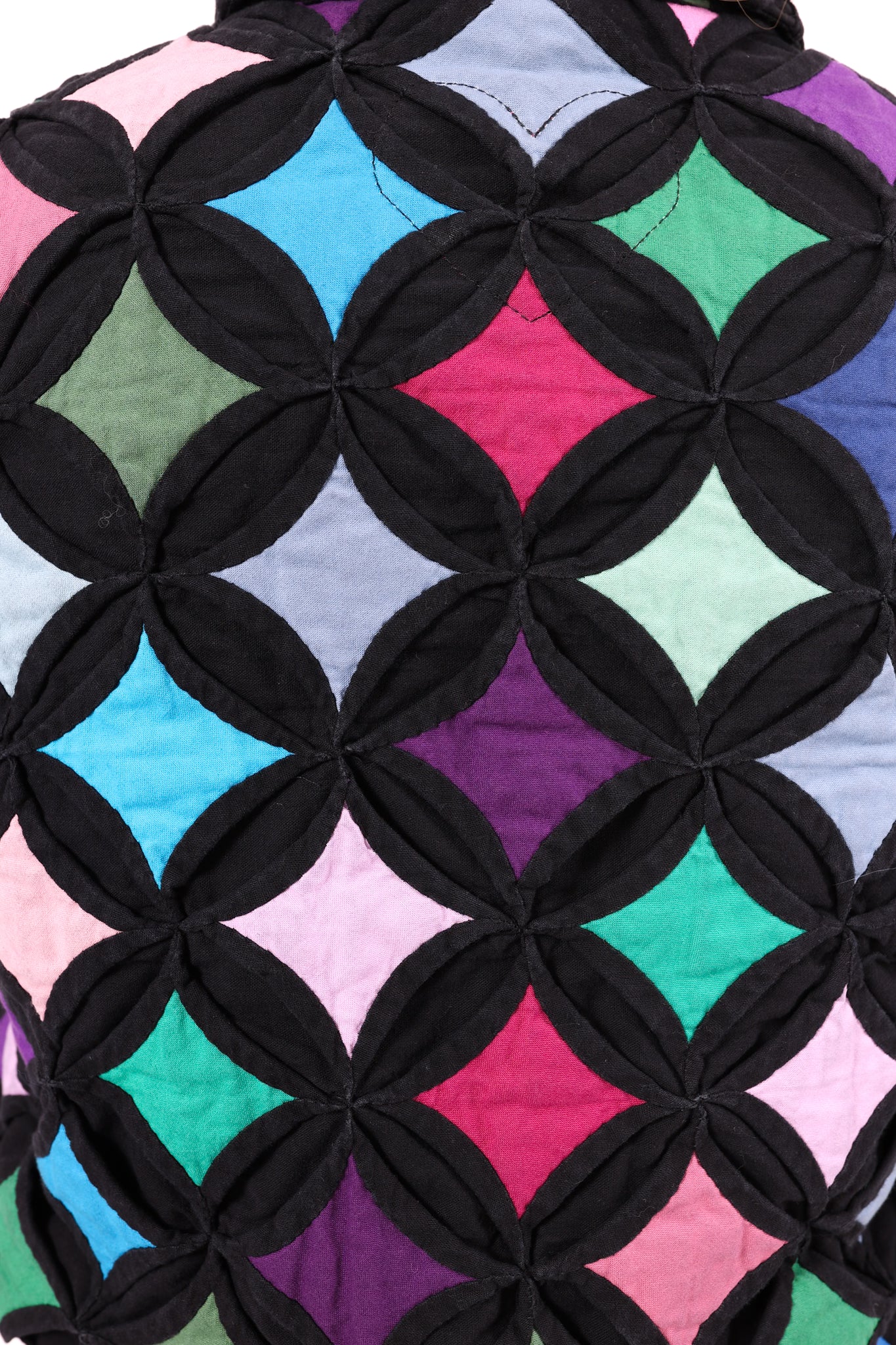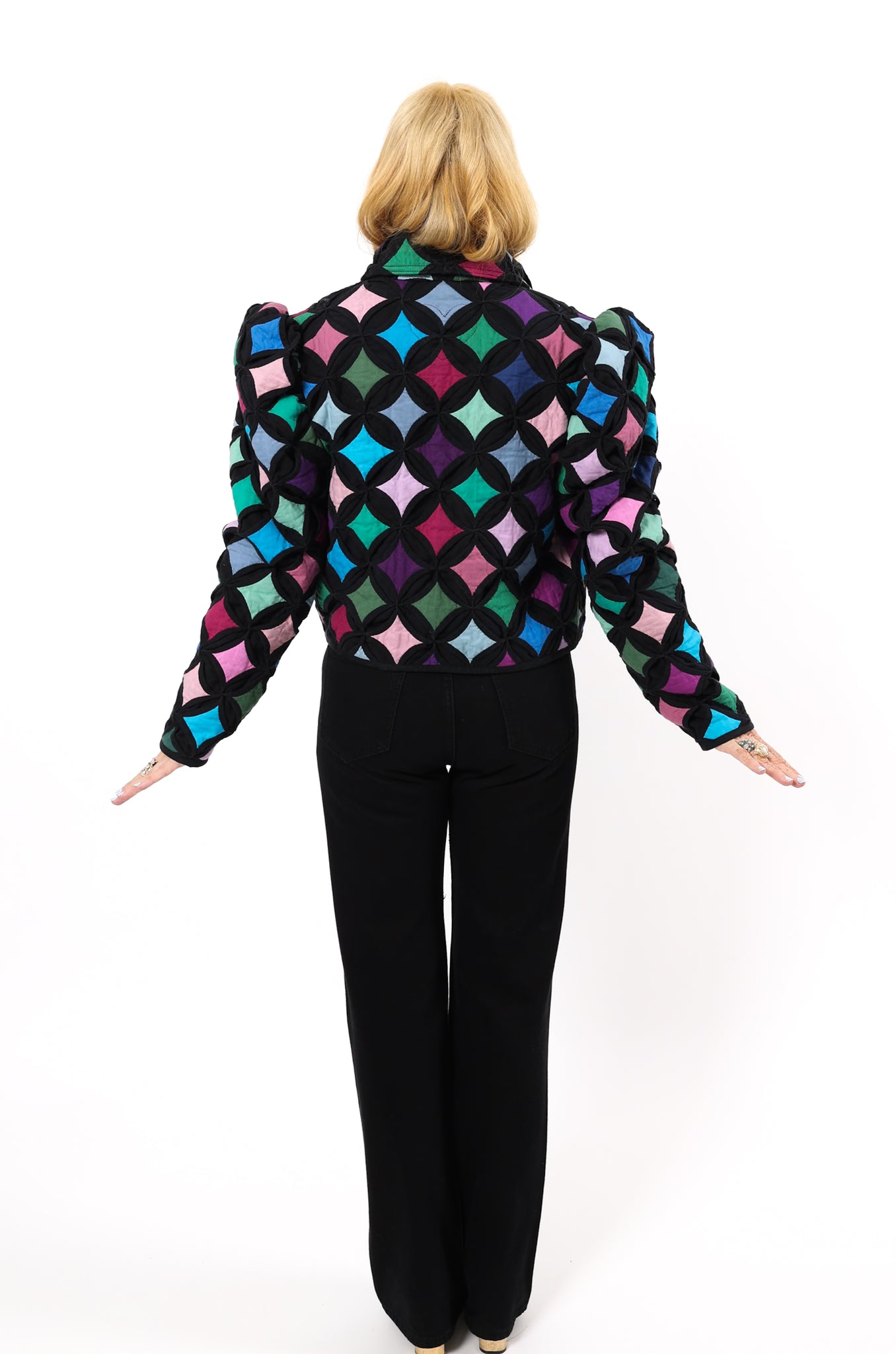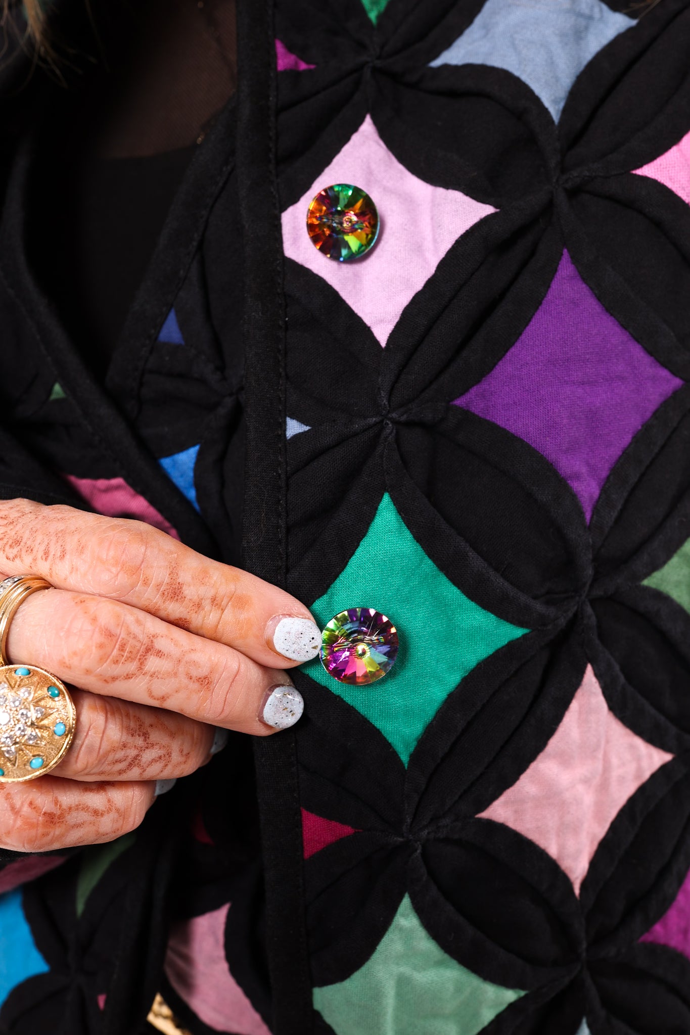 This is an Amish made quilt from a Lancaster County Mud Sale that was held at the Robert Fulton Fire Company. It is a traditional Cathedral Window quilt pattern. The window panes have been hand appliqued which is a labor of love and a lost art! To match the jewel tones of the quilt we used iridescent glass buttons! In our opinion, the quilt is thin and lightweight! It does have a little stiffness to it, which is pretty standard for this quilt style. If you're looking for a full on quilt ensemble this vest can be paired with the coordinating Wolfe Vest and Class Act Maxi. You will be the talk of the party! This is our Queen Bee jacket but without the fitted waist band. Please read measurements below for best fit! If you have any fit questions or would like to see more images or videos of this please direct message us and we would be happy to oblige.