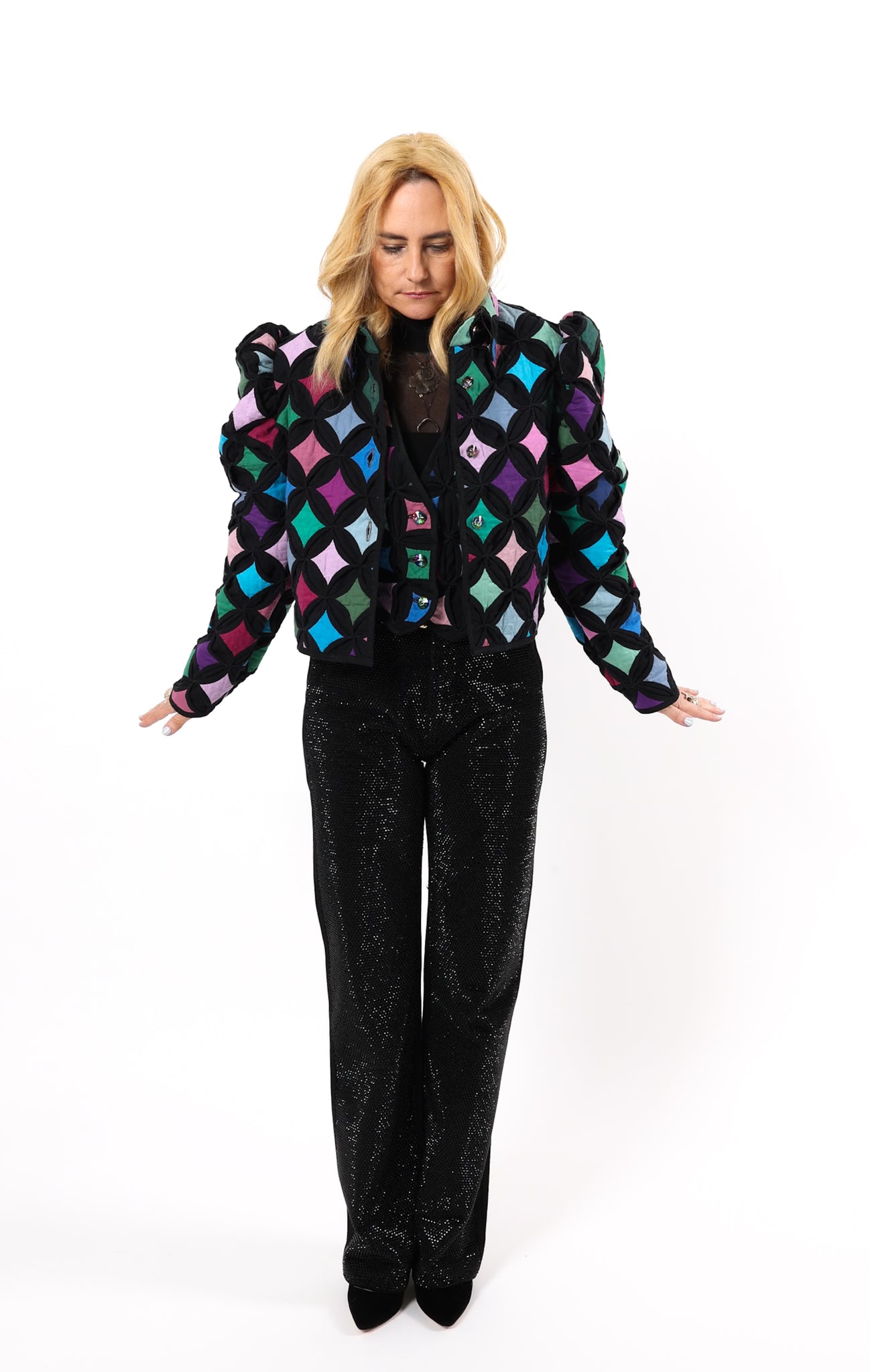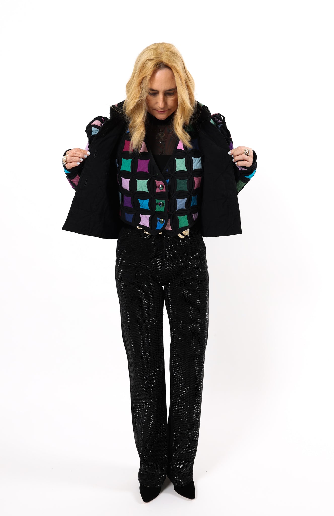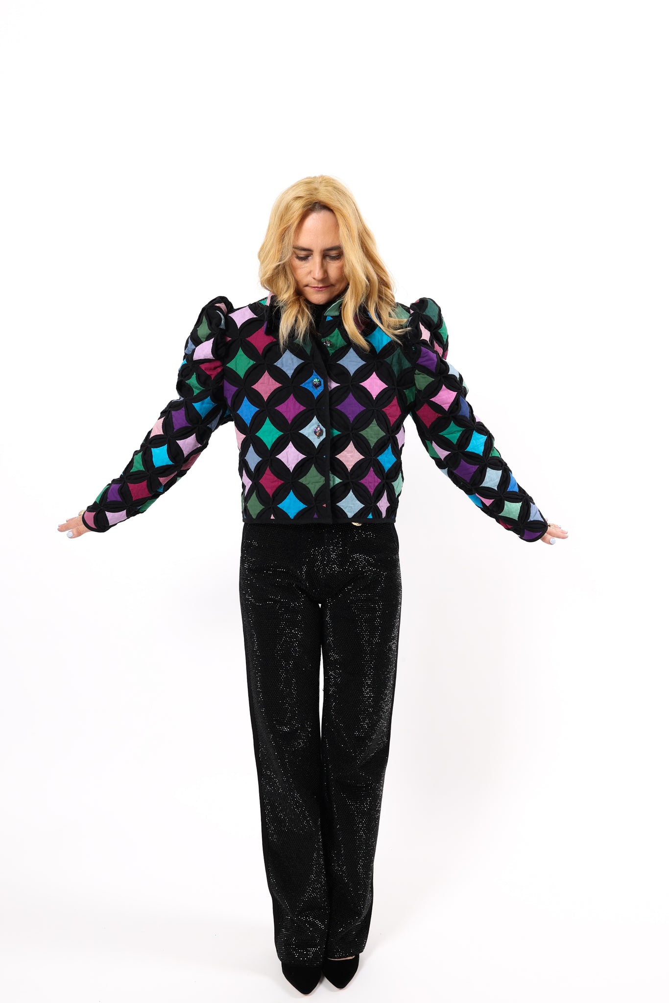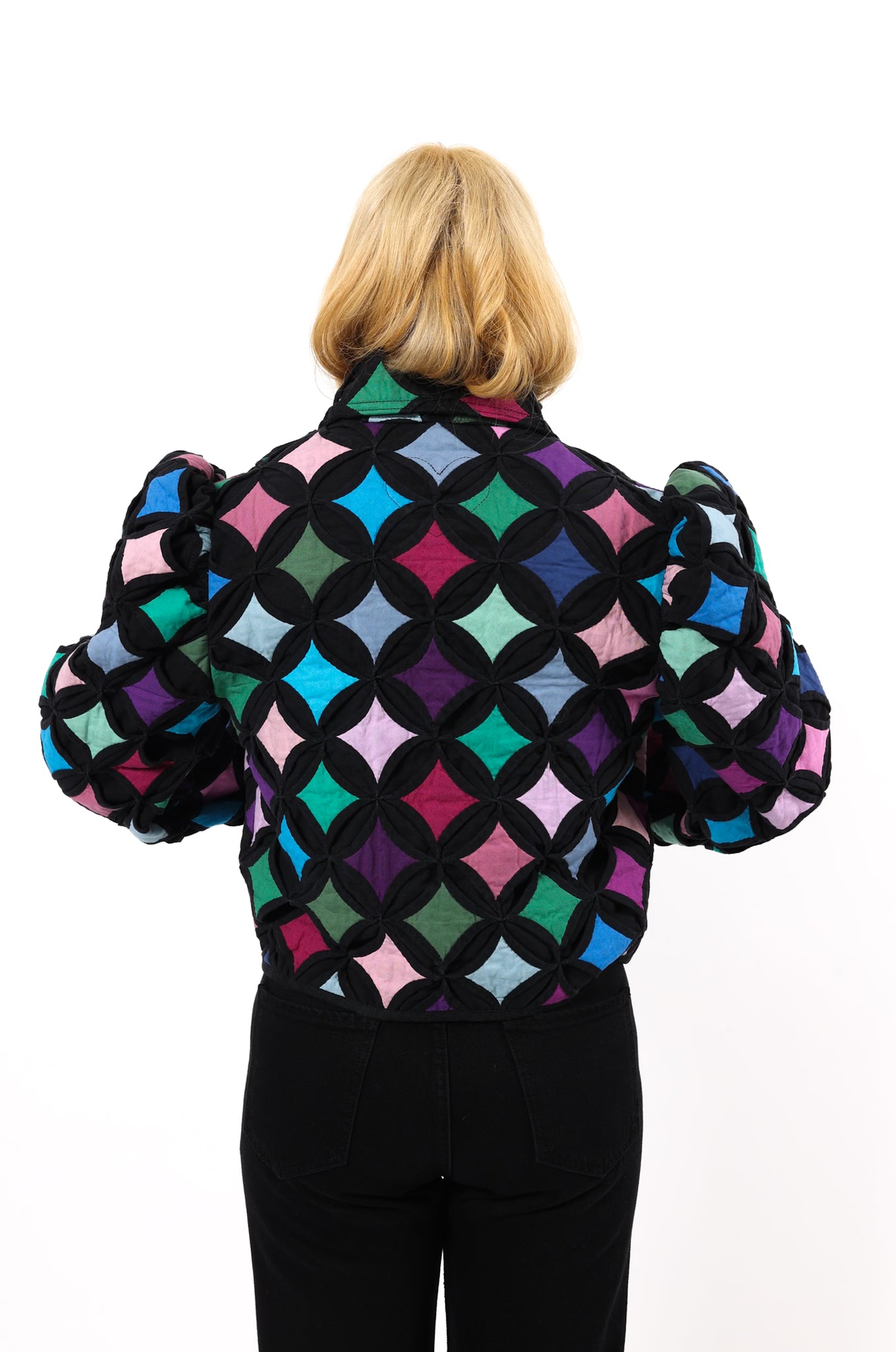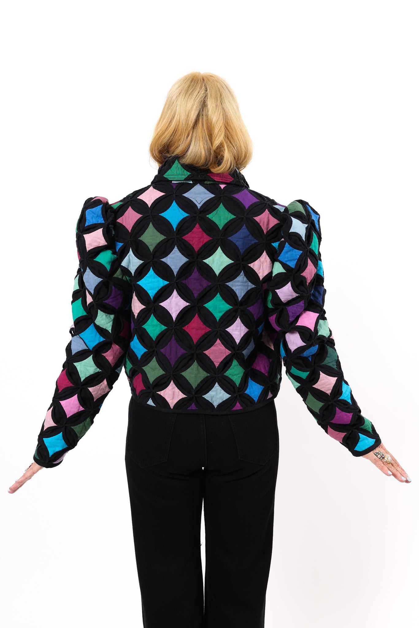 This is an Amish made quilt from a Lancaster County Mud Sale that was held at the Robert Fulton Fire Company. It is a traditional Cathedral Window quilt pattern. The window panes have been hand appliqued which is a labor of love and a lost art! To match the jewel tones of the quilt we used iridescent glass buttons! In our opinion, the quilt is thin and lightweight! It does have a little stiffness to it, which is pretty standard for this quilt style. If you're looking for a full on quilt ensemble this vest can be paired with the coordinating Wolfe Vest and Class Act Maxi. You will be the talk of the party! This is our Queen Bee jacket but without the fitted waist band. Please read measurements below for best fit! If you have any fit questions or would like to see more images or videos of this please direct message us and we would be happy to oblige.