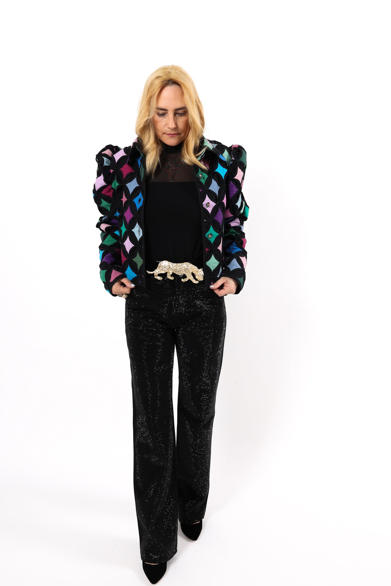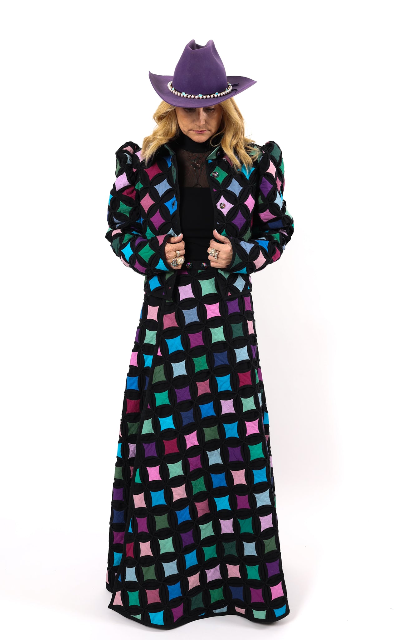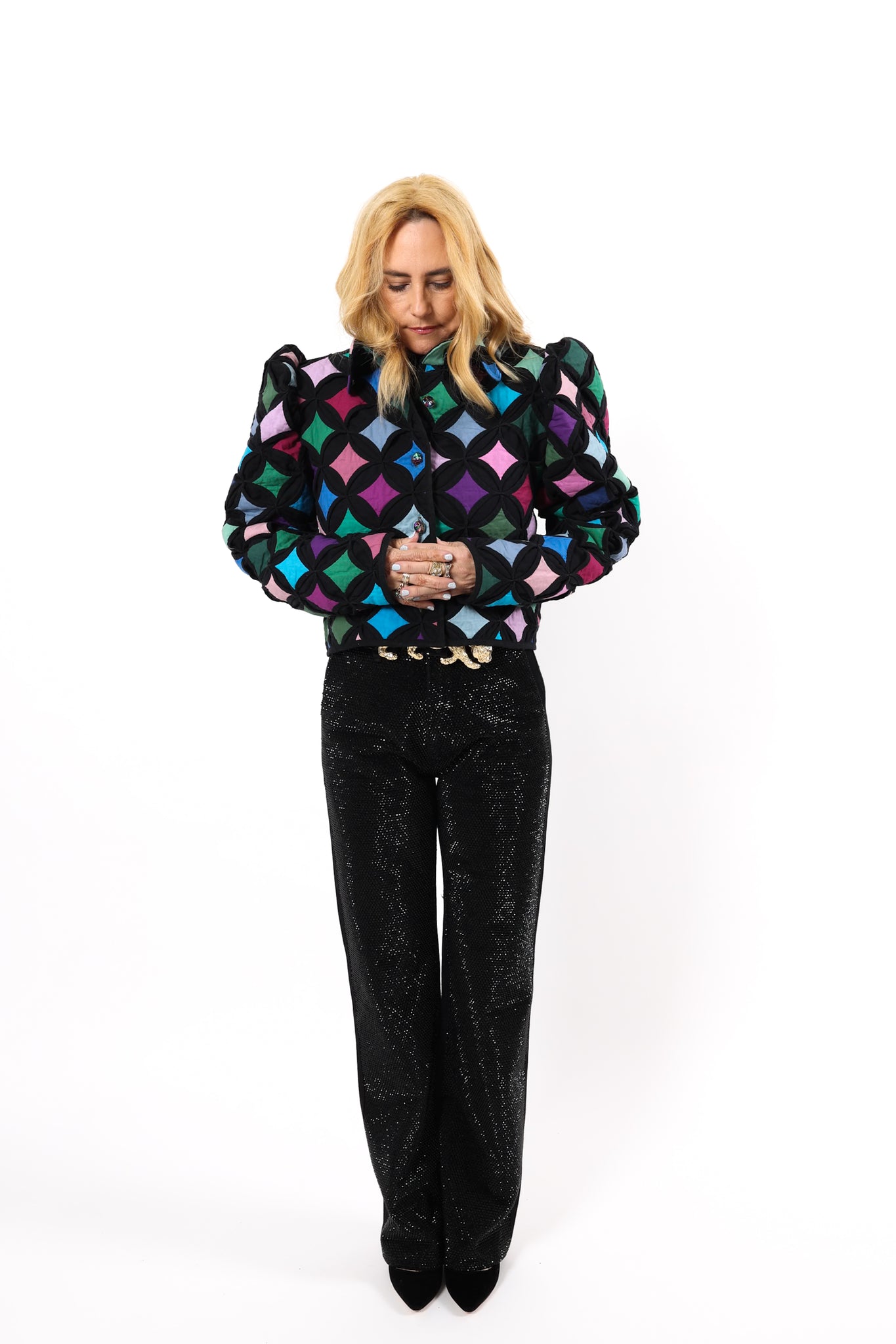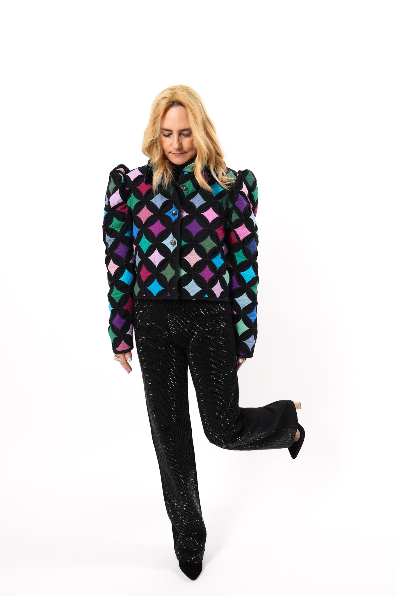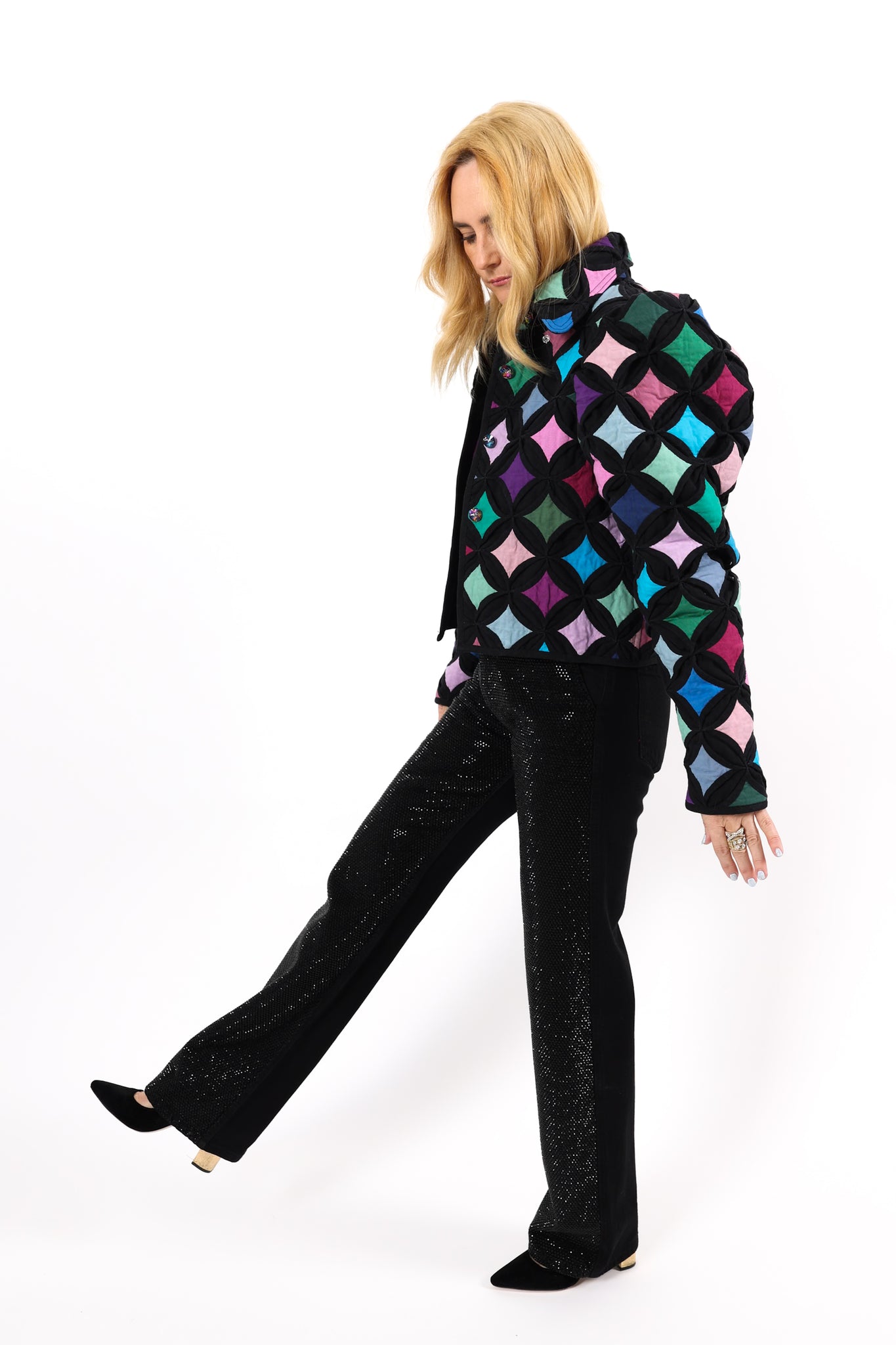 This is an Amish made quilt from a Lancaster County Mud Sale that was held at the Robert Fulton Fire Company. It is a traditional Cathedral Window quilt pattern. The window panes have been hand appliqued which is a labor of love and a lost art! To match the jewel tones of the quilt we used iridescent glass buttons! In our opinion, the quilt is thin and lightweight! It does have a little stiffness to it, which is pretty standard for this quilt style. If you're looking for a full on quilt ensemble this vest can be paired with the coordinating Wolfe Vest and Class Act Maxi. You will be the talk of the party! This is our Queen Bee jacket but without the fitted waist band. Please read measurements below for best fit! If you have any fit questions or would like to see more images or videos of this please direct message us and we would be happy to oblige.