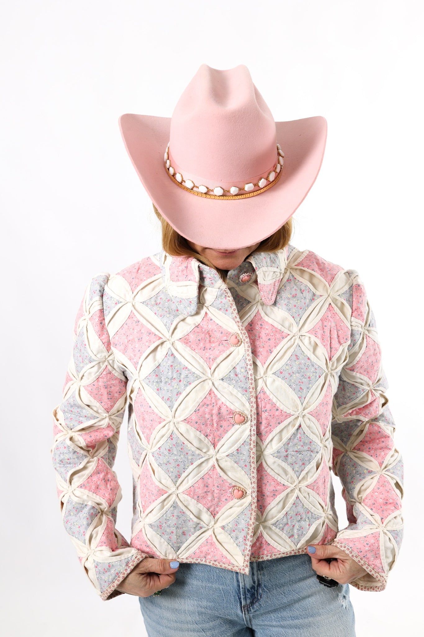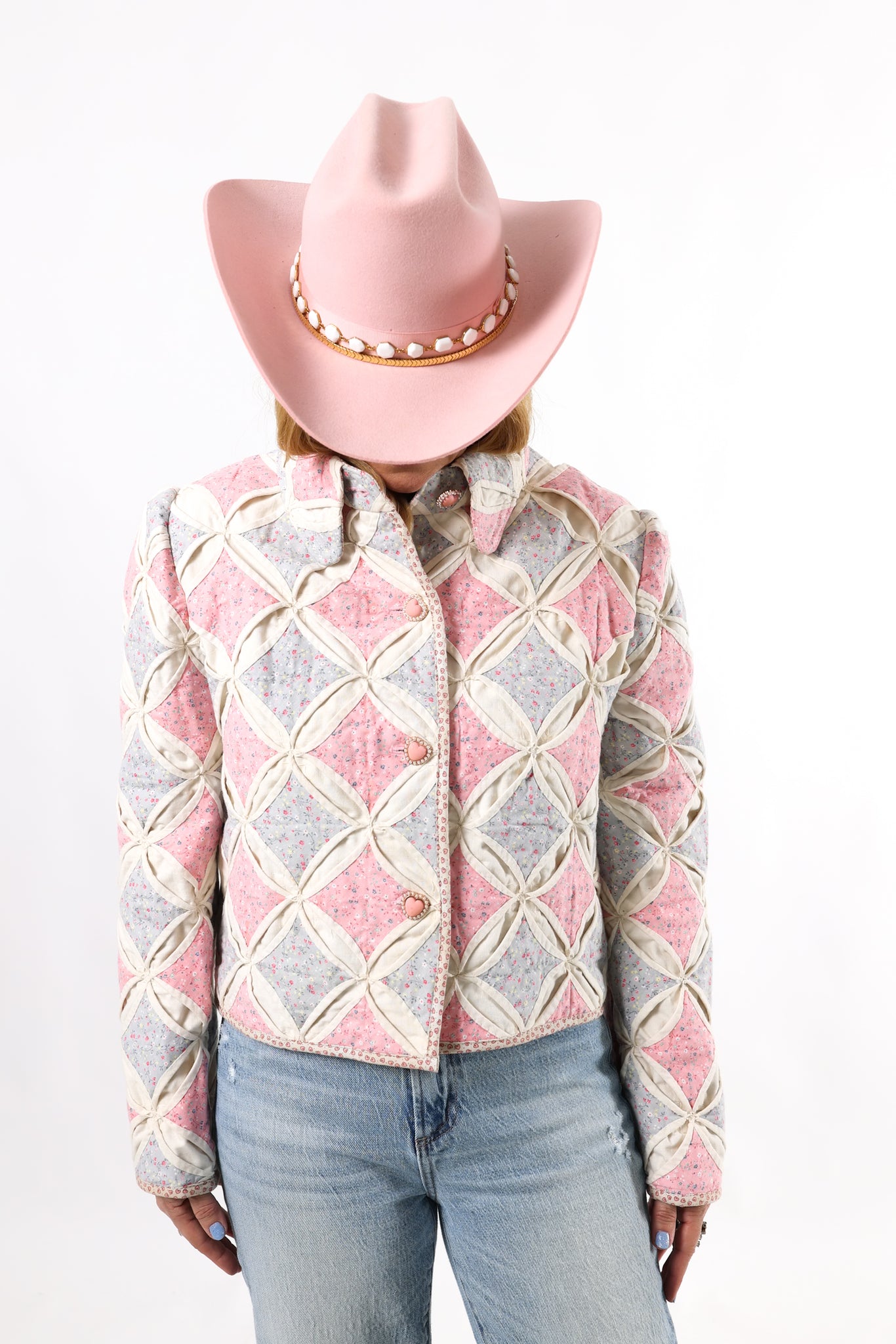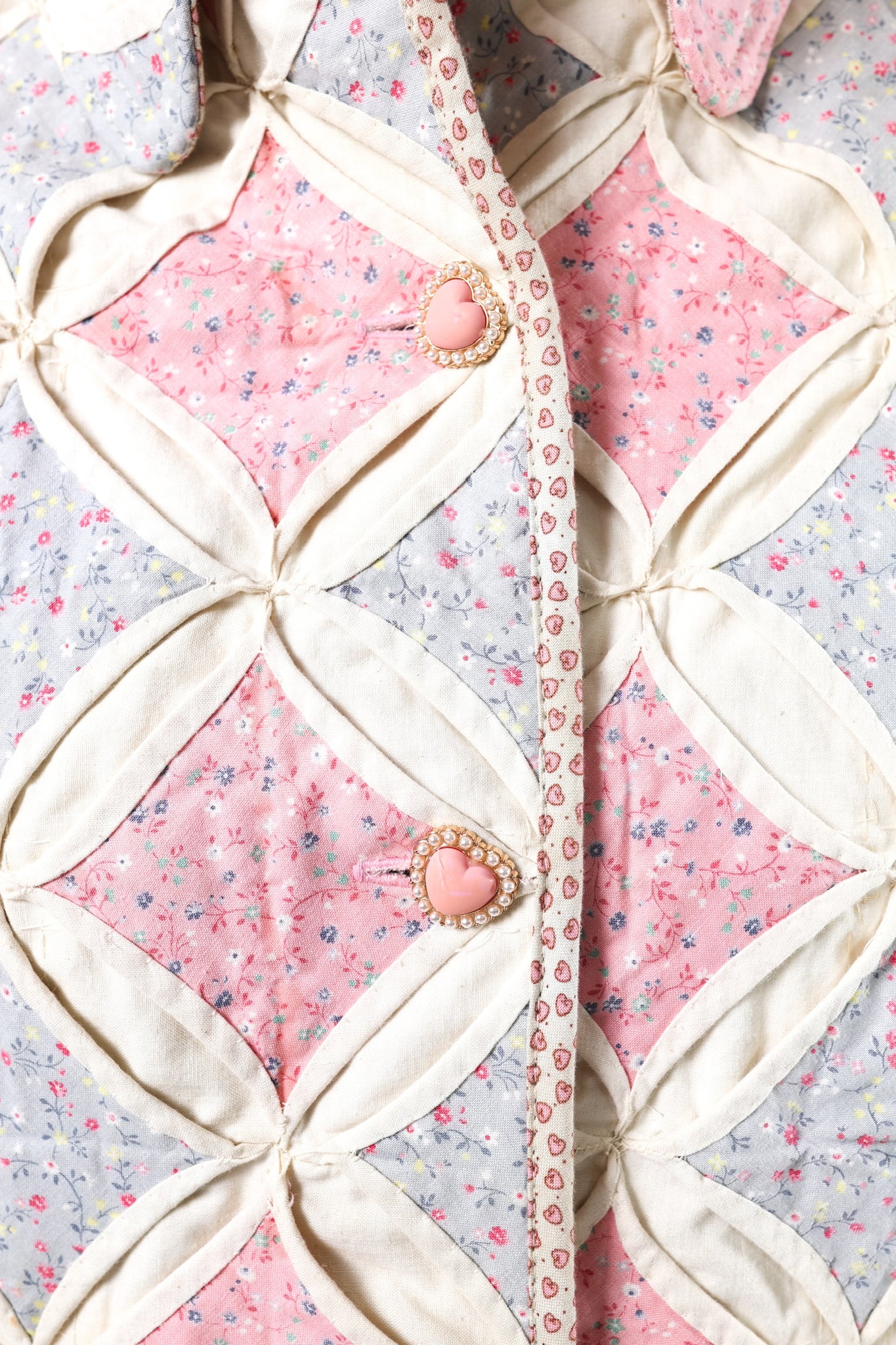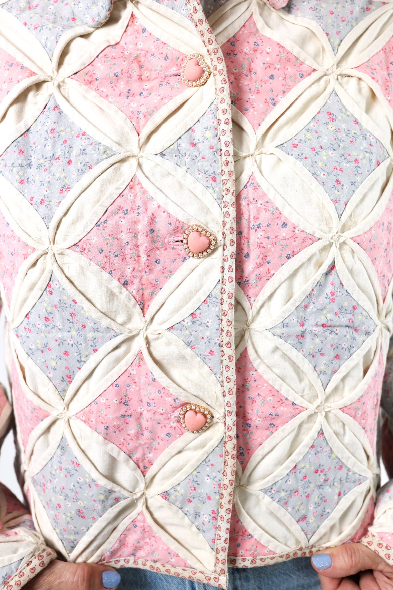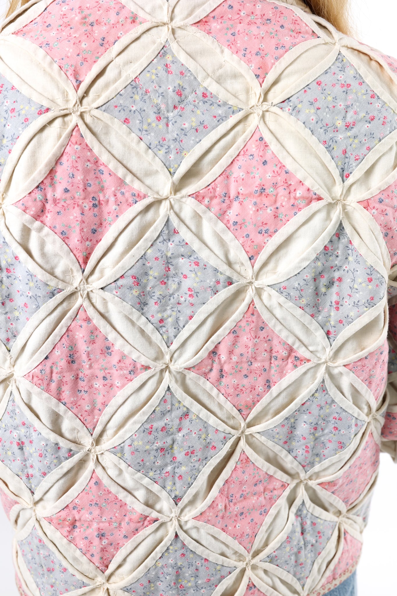 This is for our cutie pastel girlies! This is an American quilt made circa 1970s-1980s. It is a traditional Cathedral Window quilt pattern. It is beautifully hand sewn. The around fabric is almond, not white nor was it meant to be white. In our opinion, the jacket is thin, lightweight, and soft. We used pink heart button as closures. The quilt is in great condition for its age. This is a size S. Please see size guide and length measurements below. If you have any questions on size or fit please direct message us and we would be happy to help.