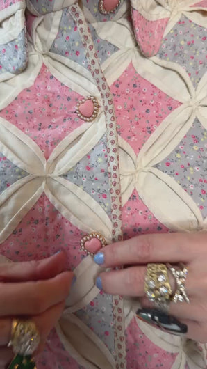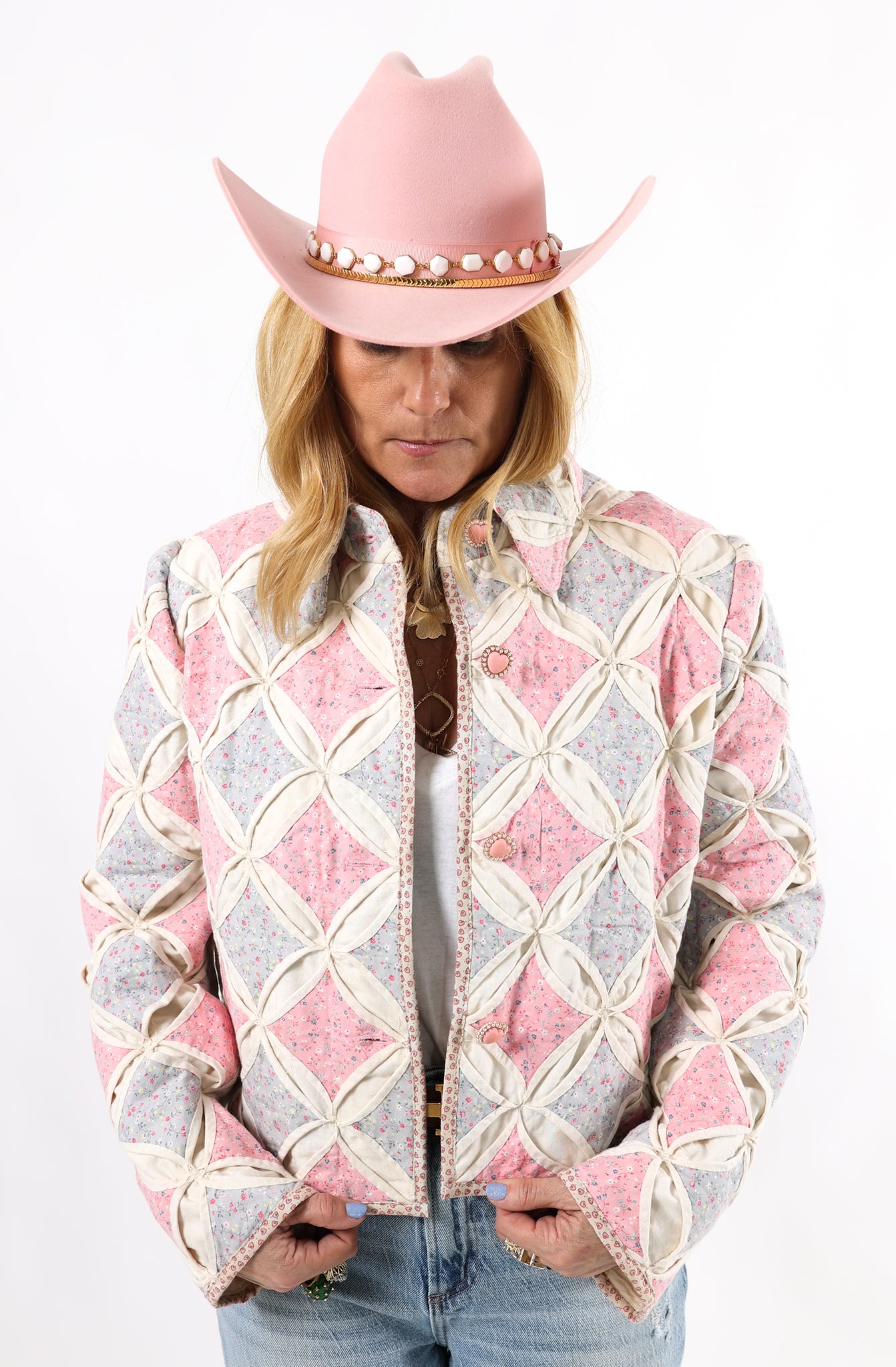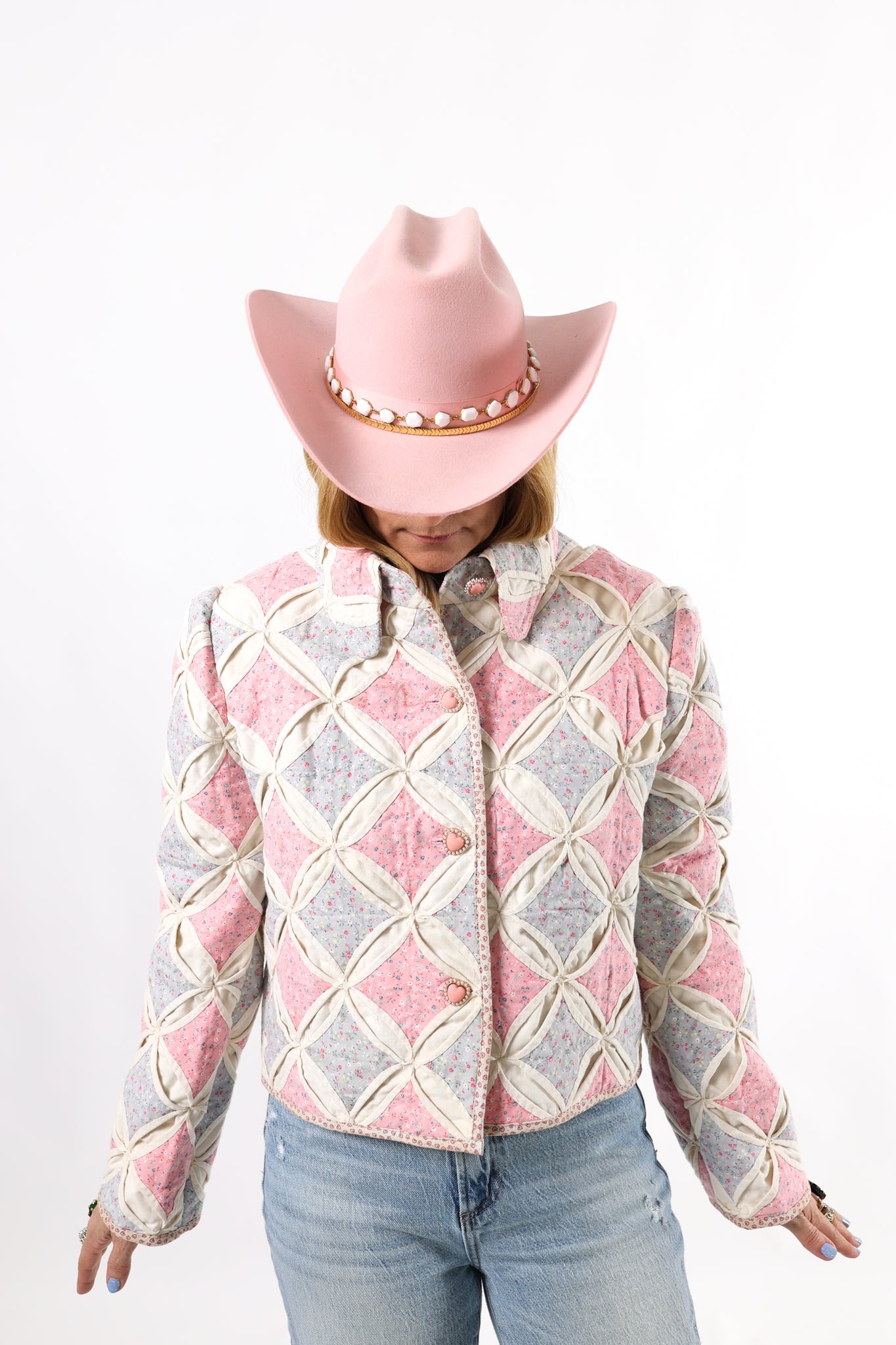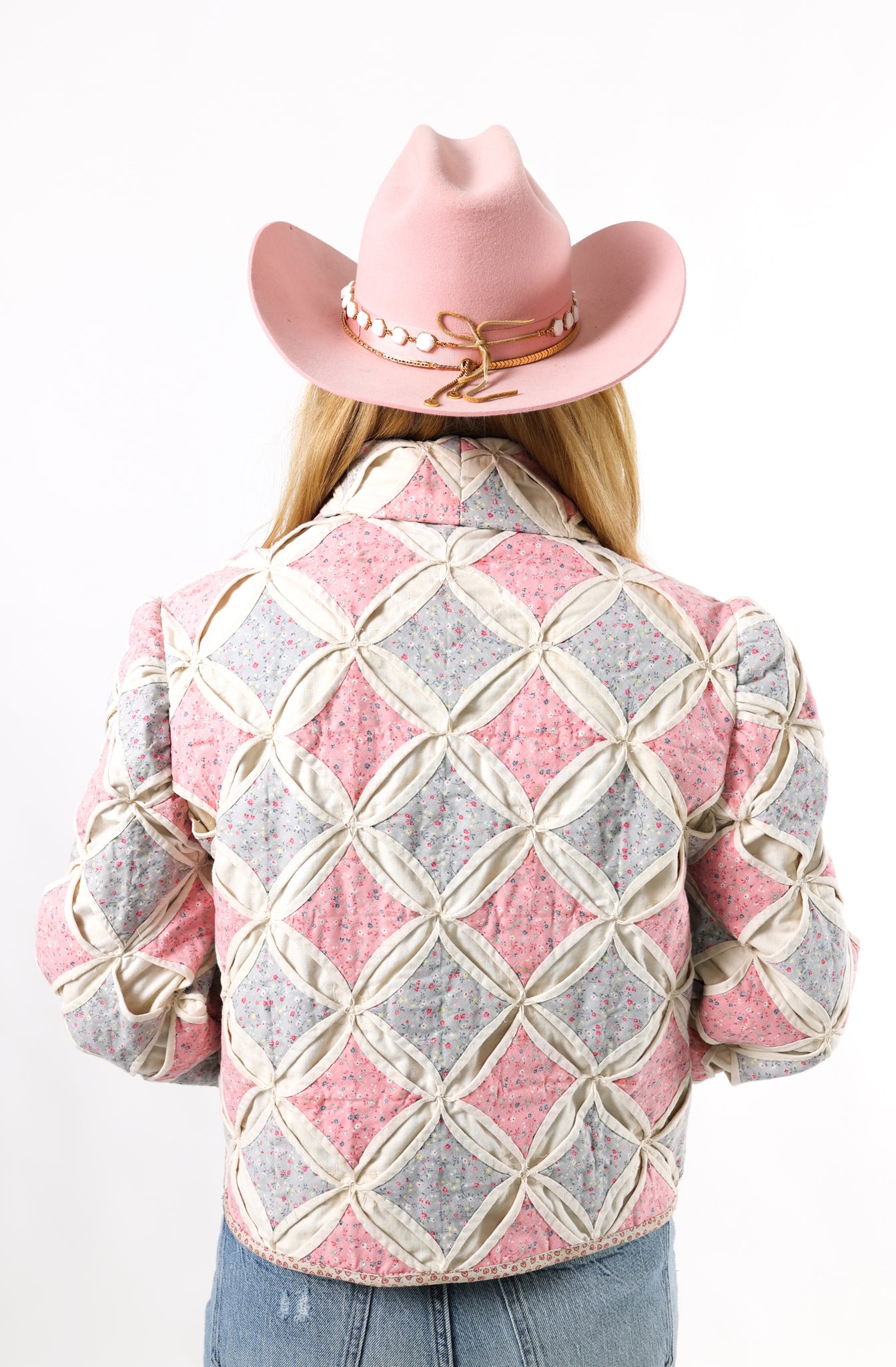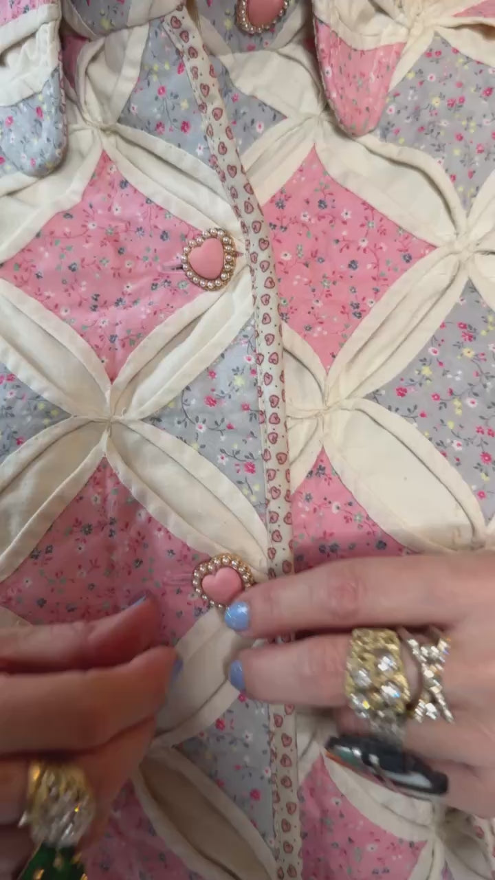 This is for our cutie pastel girlies! This is an American quilt made circa 1970s-1980s. It is a traditional Cathedral Window quilt pattern. It is beautifully hand sewn. The around fabric is almond, not white nor was it meant to be white. In our opinion, the jacket is thin, lightweight, and soft. We used pink heart button as closures. The quilt is in great condition for its age. This is a size S. Please see size guide and length measurements below. If you have any questions on size or fit please direct message us and we would be happy to help.