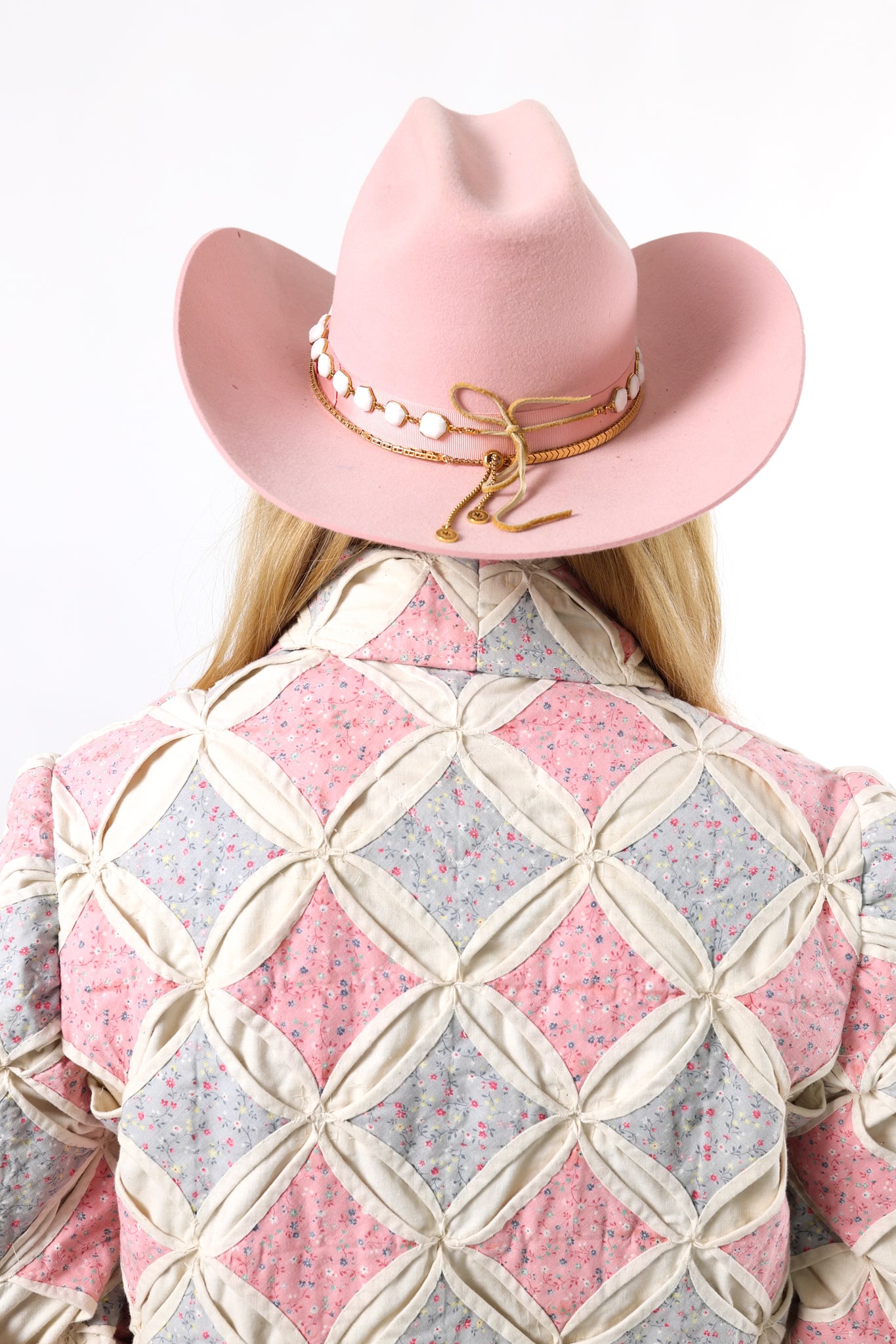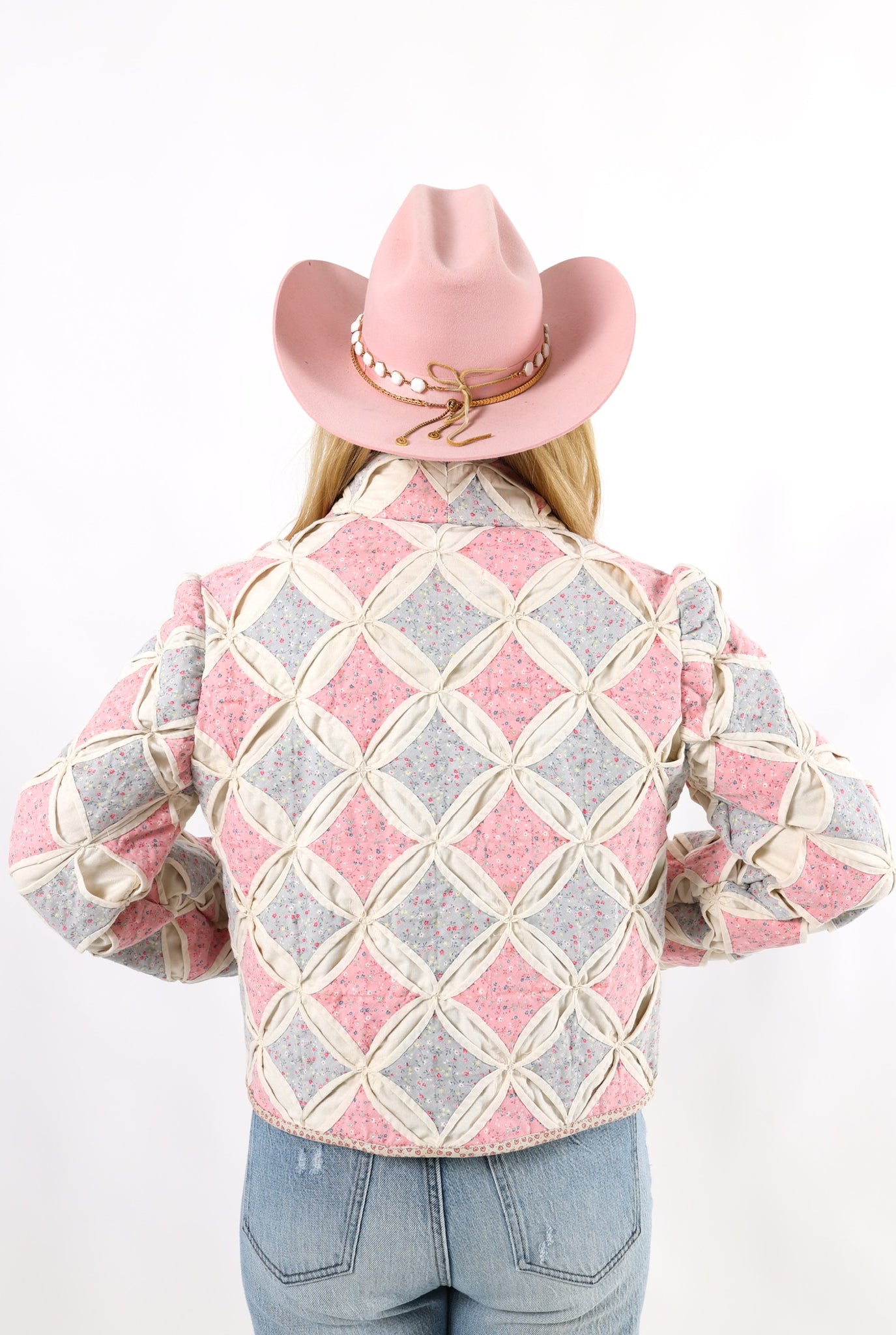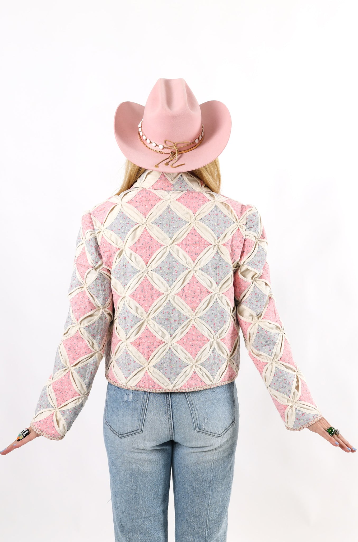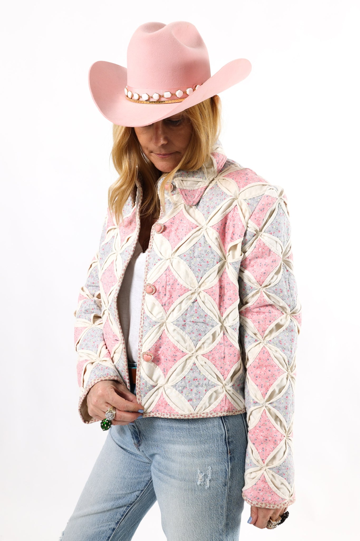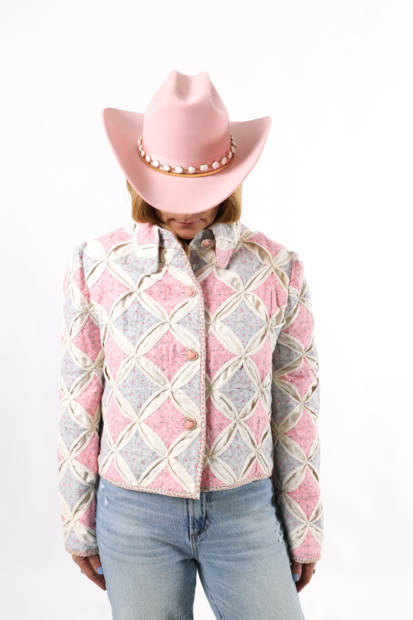 This is for our cutie pastel girlies! This is an American quilt made circa 1970s-1980s. It is a traditional Cathedral Window quilt pattern. It is beautifully hand sewn. The around fabric is almond, not white nor was it meant to be white. In our opinion, the jacket is thin, lightweight, and soft. We used pink heart button as closures. The quilt is in great condition for its age. This is a size S. Please see size guide and length measurements below. If you have any questions on size or fit please direct message us and we would be happy to help.