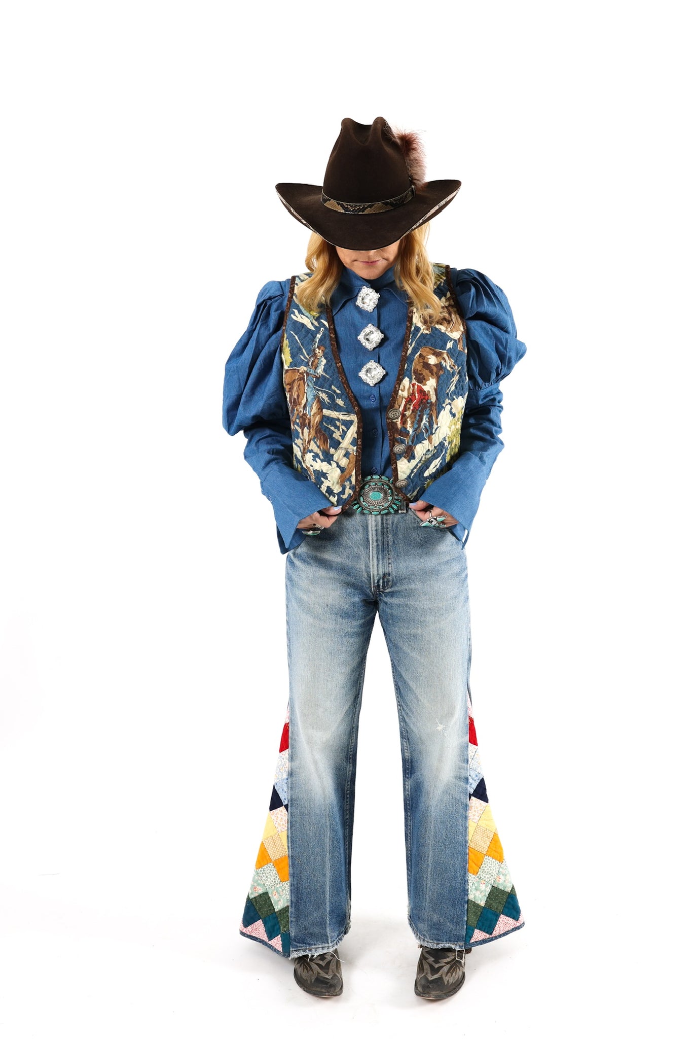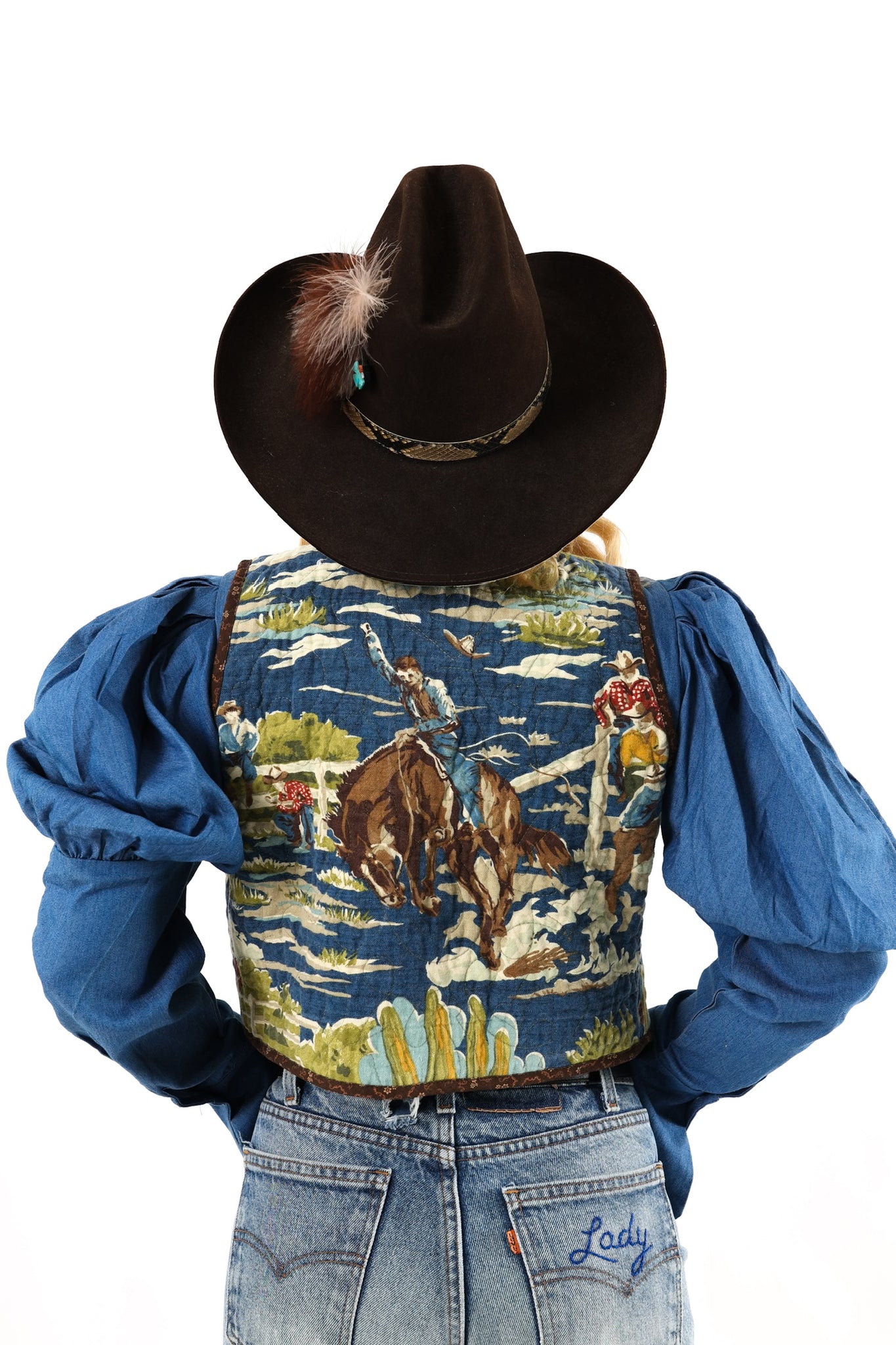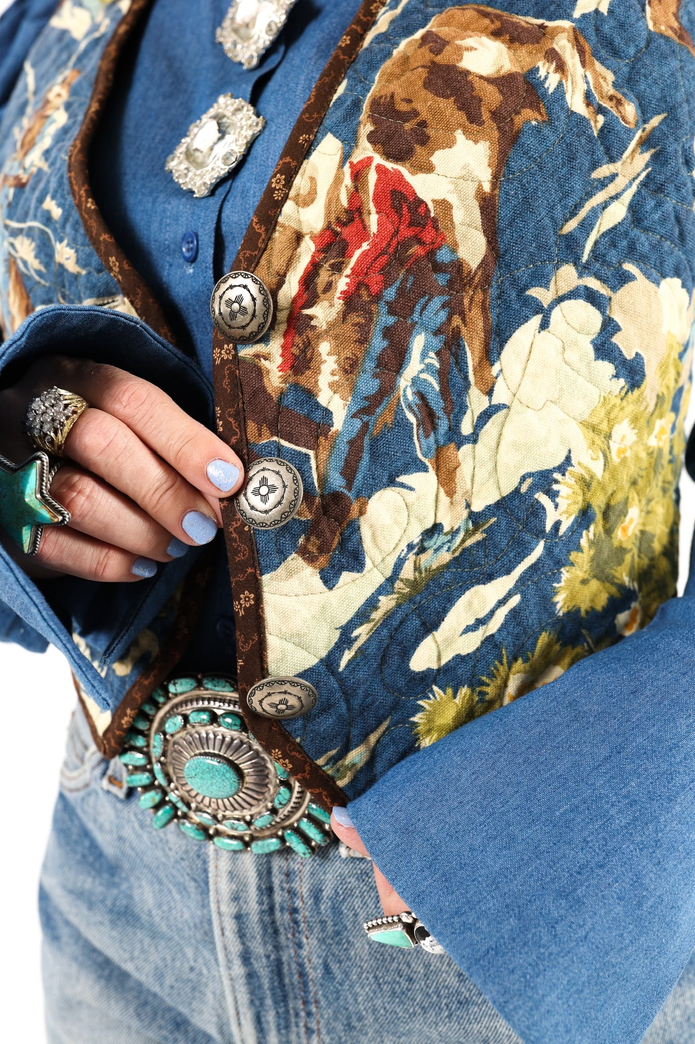This is a Lady Lancaster original. This quilt is a combination of midcentury barkcloth or drapery fabric that was created for boys bedrooms and premium turn of the century reproduction fabric. The quilt is not hand sewn but was completed by Zoe Dawn and her long arm. For closures there are faux silver concho buttons that add to the overall western feel! In our opinion, the vest is thin and lightweight. This is a size medium. We designed this vest to be a fitted piece. It can be worn over a shirt or as a shirt. Please make sure to read the measurements below before ordering. If you have further questions, please direct message us and we are happy to send you a video.