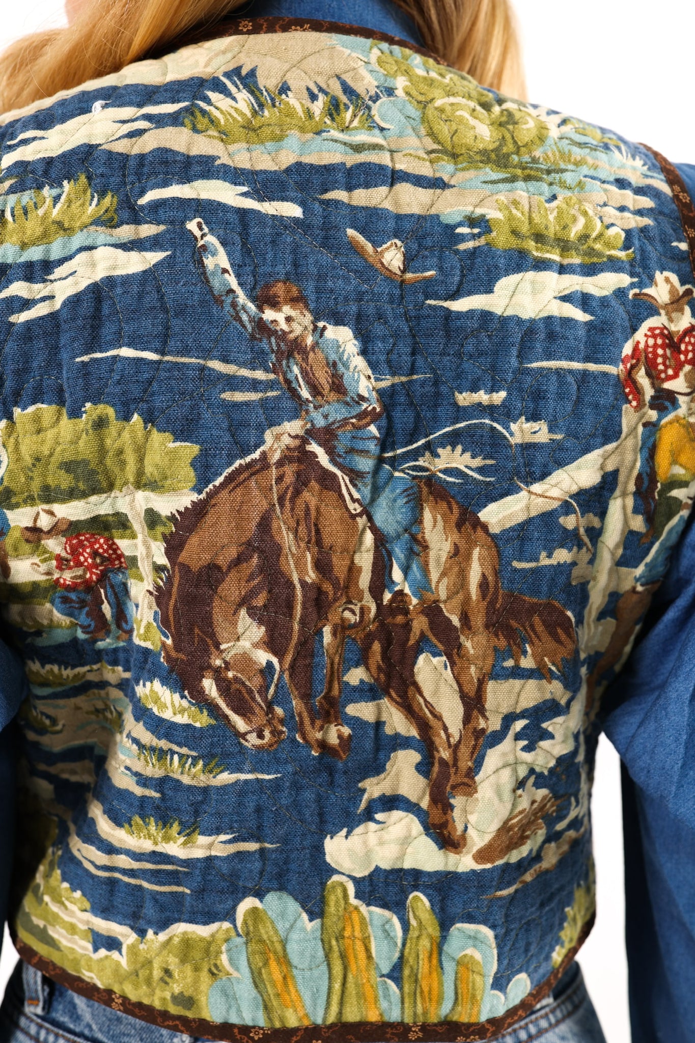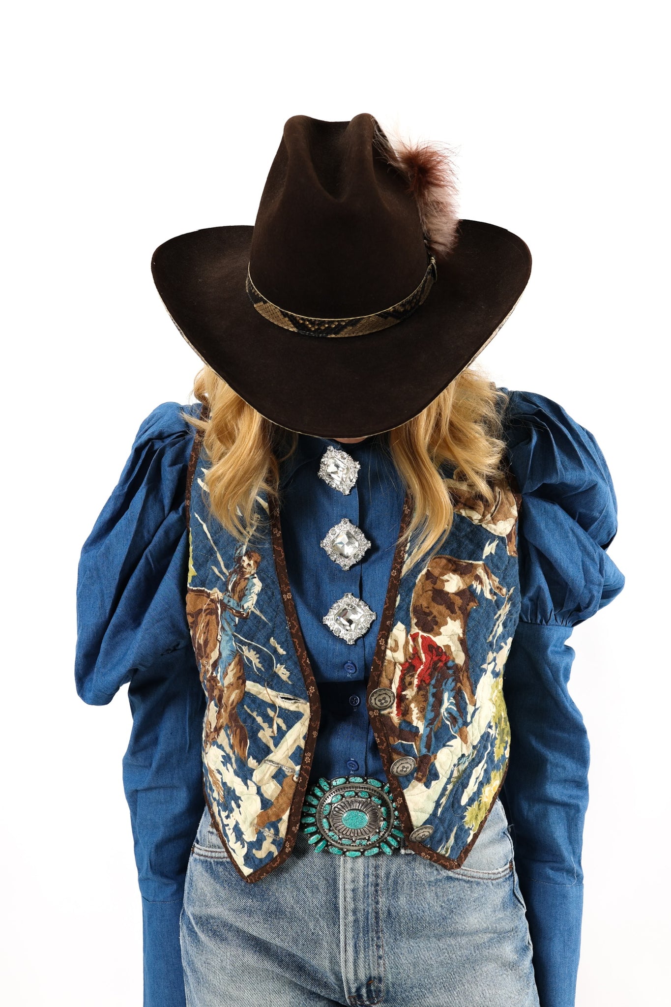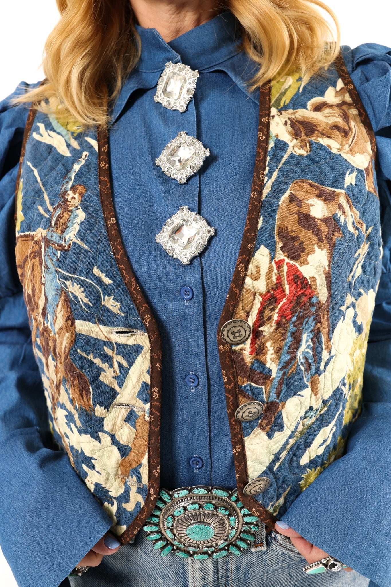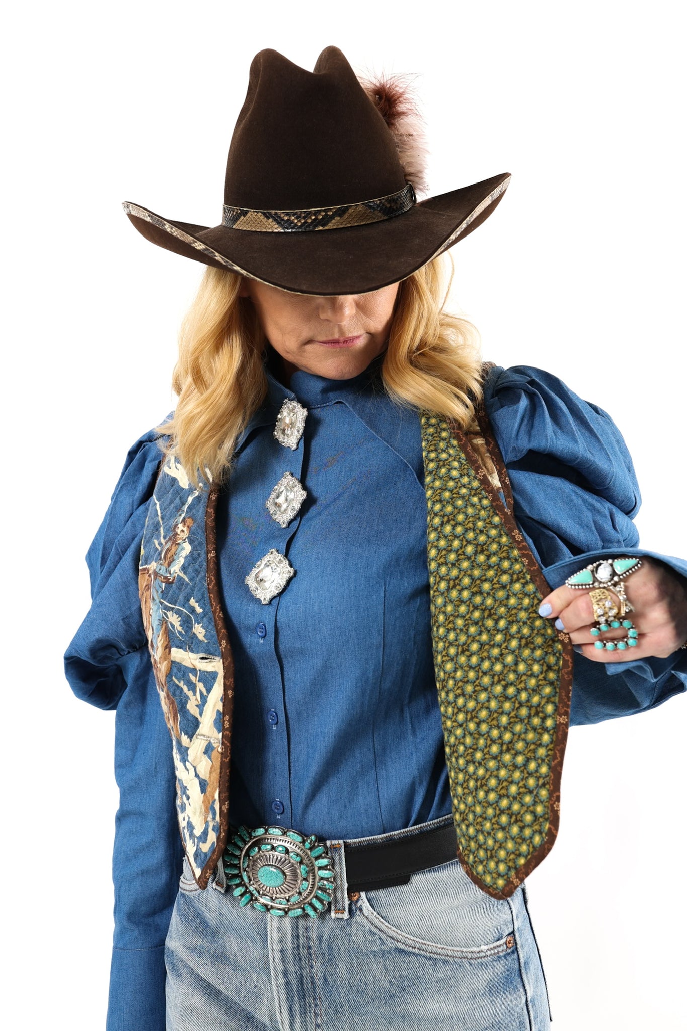 This is a Lady Lancaster original. This quilt is a combination of midcentury barkcloth or drapery fabric that was created for boys bedrooms and premium turn of the century reproduction fabric. The quilt is not hand sewn but was completed by Zoe Dawn and her long arm. For closures there are faux silver concho buttons that add to the overall western feel! In our opinion, the vest is thin and lightweight. This is a size medium. We designed this vest to be a fitted piece. It can be worn over a shirt or as a shirt. Please make sure to read the measurements below before ordering. If you have further questions, please direct message us and we are happy to send you a video.