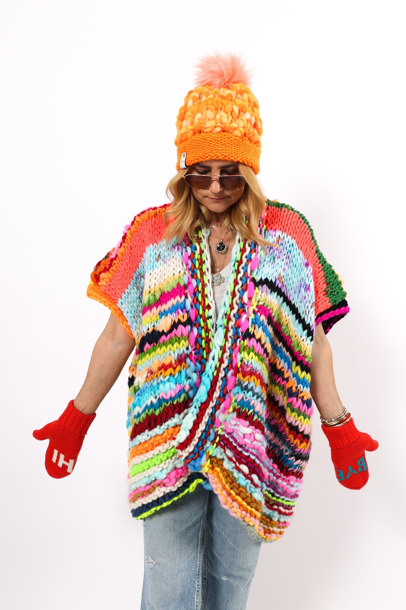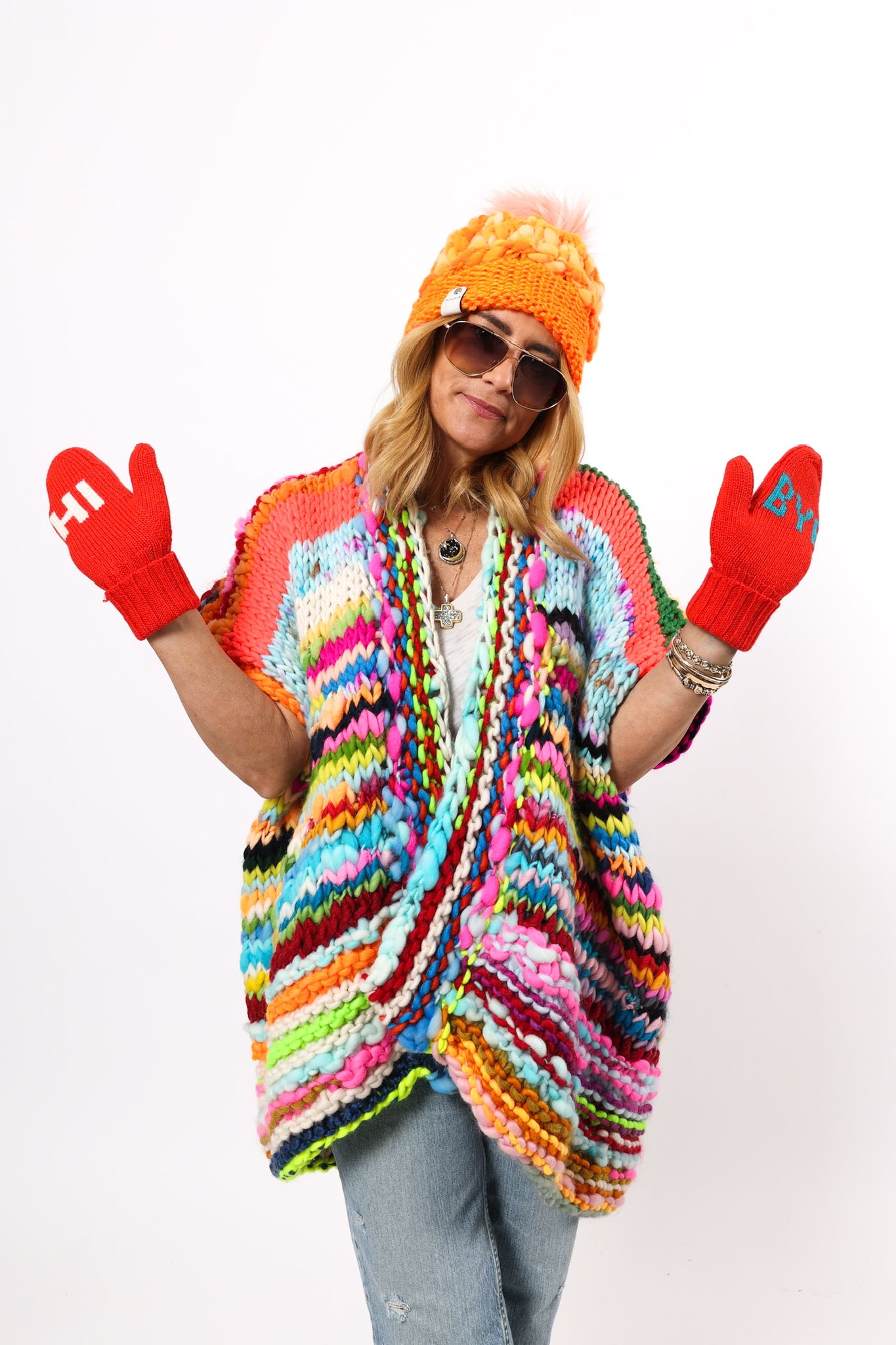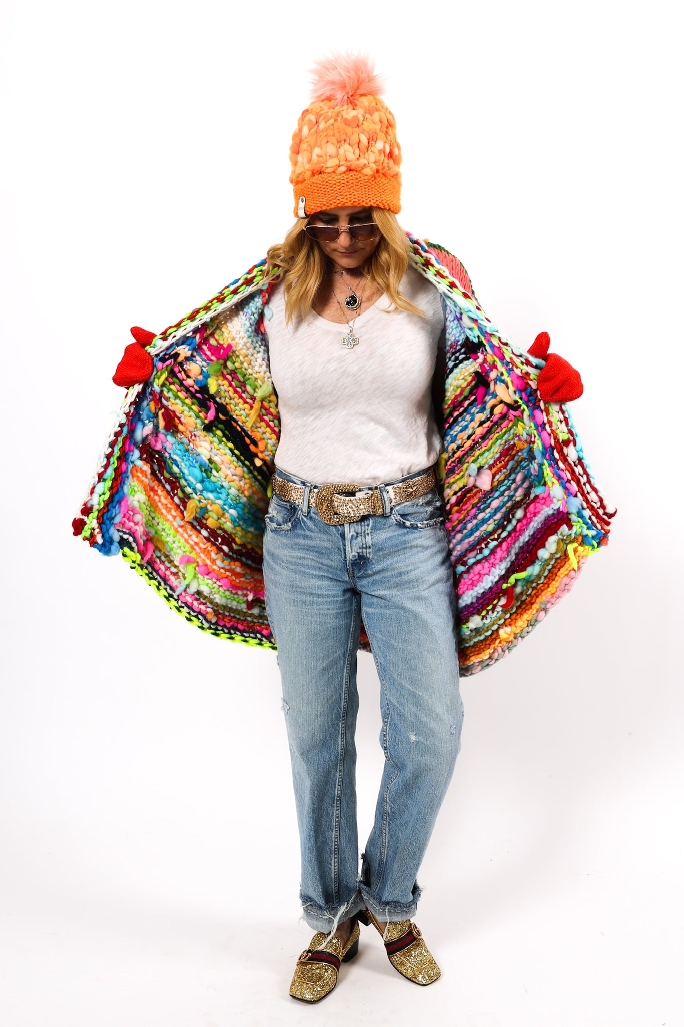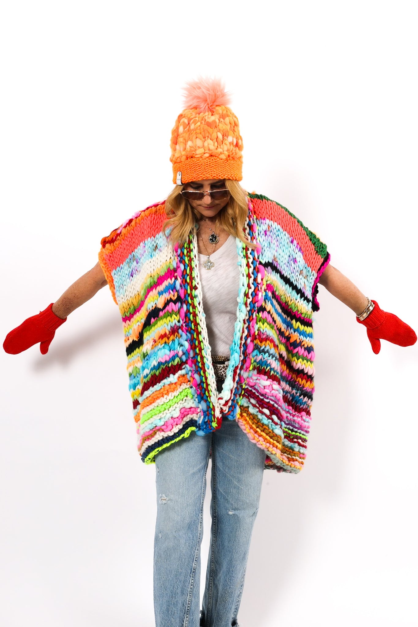 Each piece is curated for fashion and functionality, offering warmth paired with unique and vibrant colors. The chunky hand knitting gives one of a kind depth and texture! The materials used in the making of Yospun pieces include - Marino silk, Marino wool, yarn, bamboo silk, and sheep’s fleece.